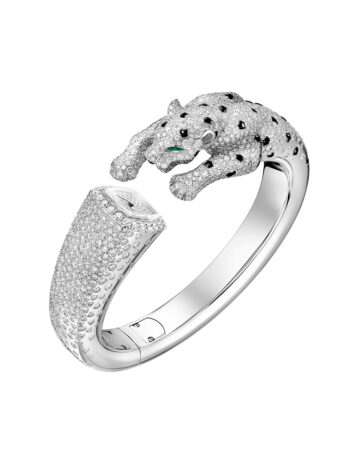 Un reloj joya que conecta ambas disciplinas a través de una pantera tridimensional que se detiene justo en el punto de abalanzarse, el brazalete toi&moi con el felino en un extremo y el reloj en el otro. El cuerpo está en movimiento, manchas y nariz en ónix, detalles en orejas y hasta las almohadillas bajo las patas. Ojos de esmeralda, una nueva forma de medir el tiempo con la elegancia y el rugido de una pantera.