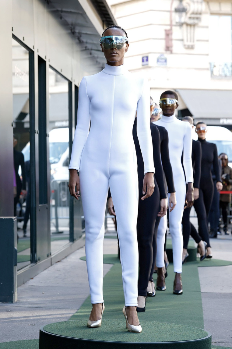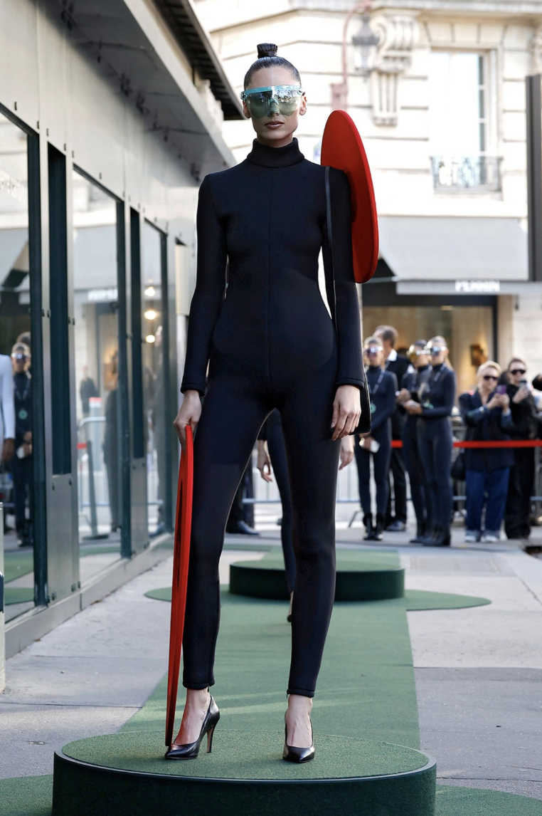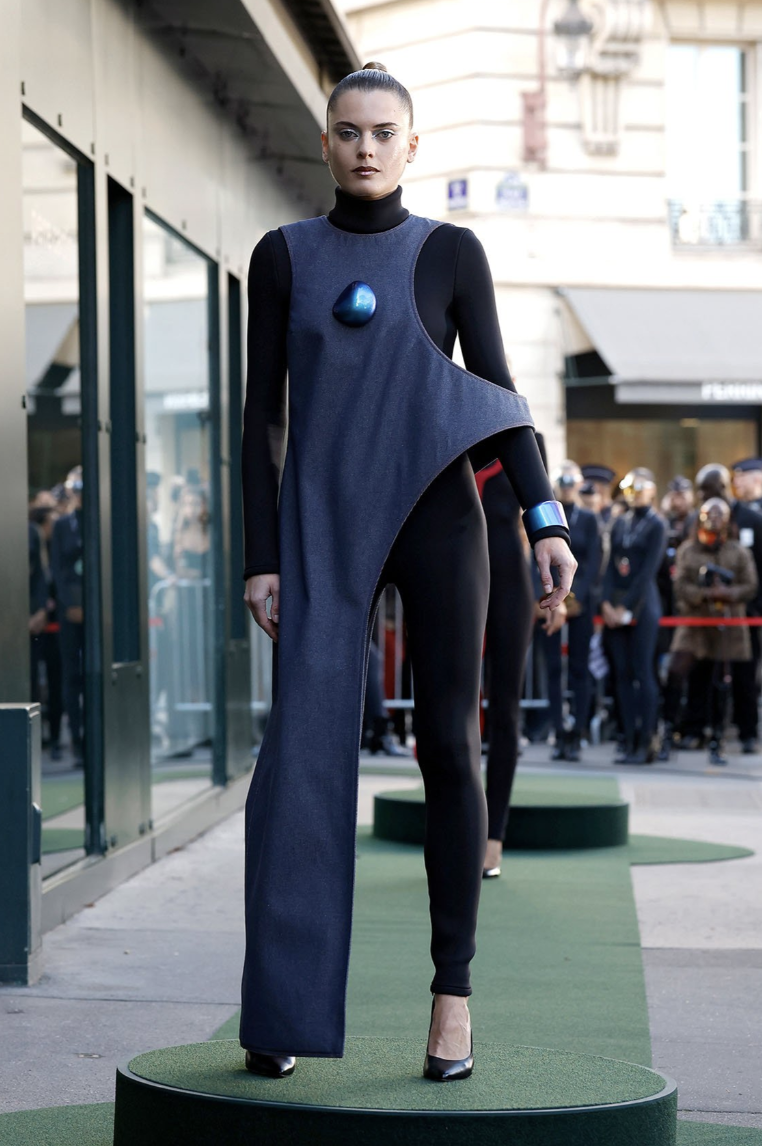 Los accesorios también tuvieron un papel fundamental: lentes futuristas de espejo, zapatos puntiagudos de vinilo negro y detalles tridimensionales que simulaban órbitas alrededor del cuerpo. Todo ello evocó un universo alternativo donde la moda no se limita a vestir, sino a comunicar identidad.