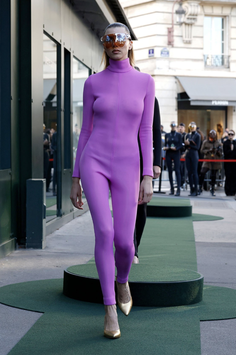 El show presentó una secuencia impecable de diseños que desafiaron la gravedad visual. Las modelos, envueltas en monos estructurados de corte anatómico, parecían desafiar el tiempo. Las piezas más icónicas se destacaron por sus formas circulares y geométricas en tonos vibrantes como el rojo, verde esmeralda y violeta eléctrico. Cada detalle parecía pensado para resaltar la individualidad de quien los lleva.