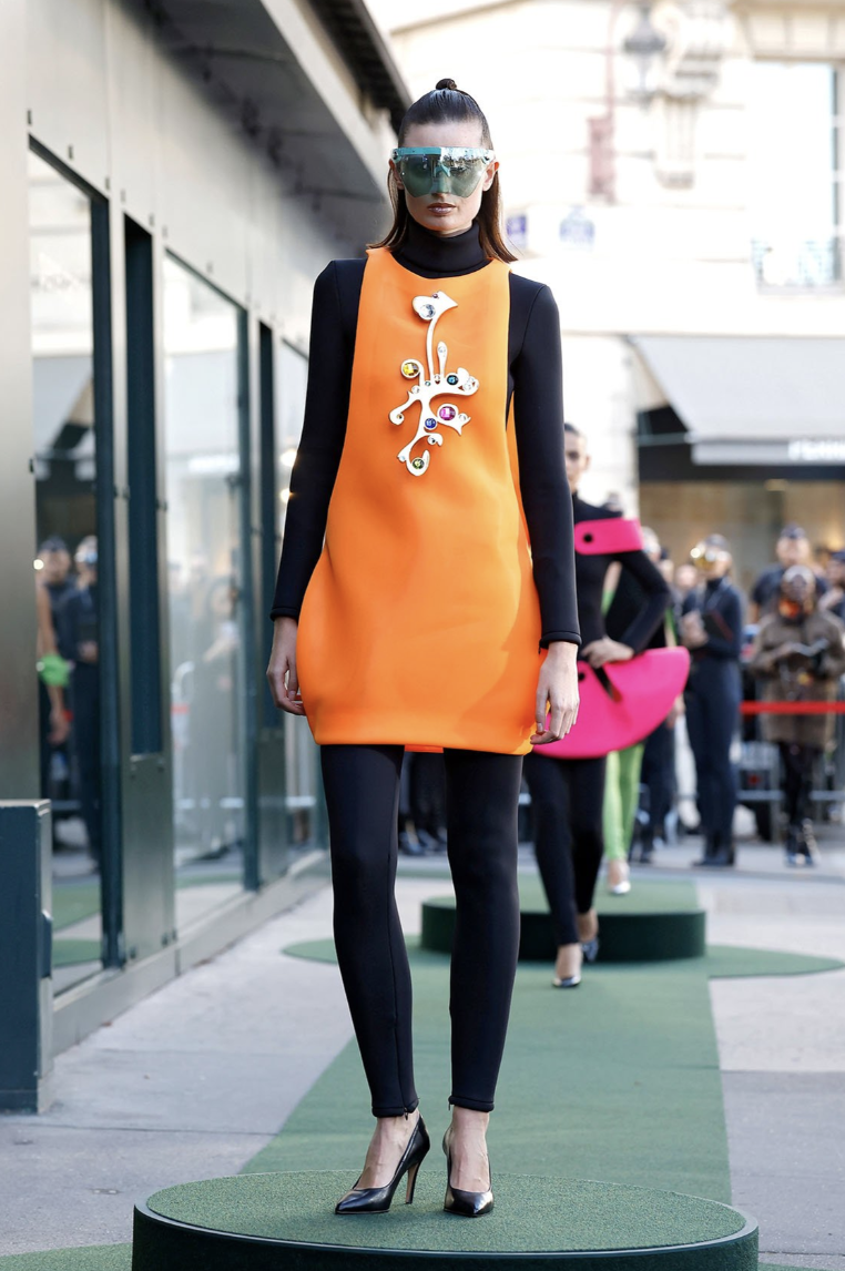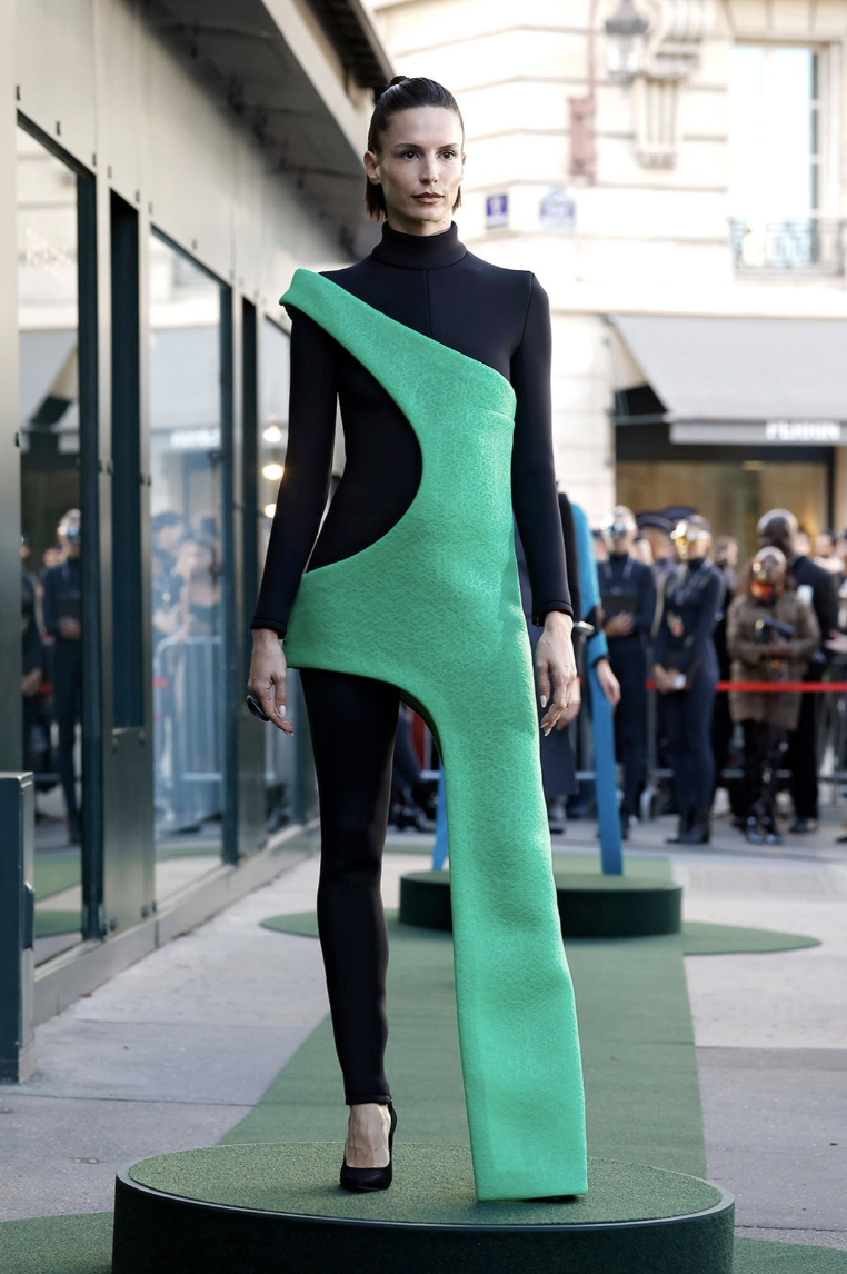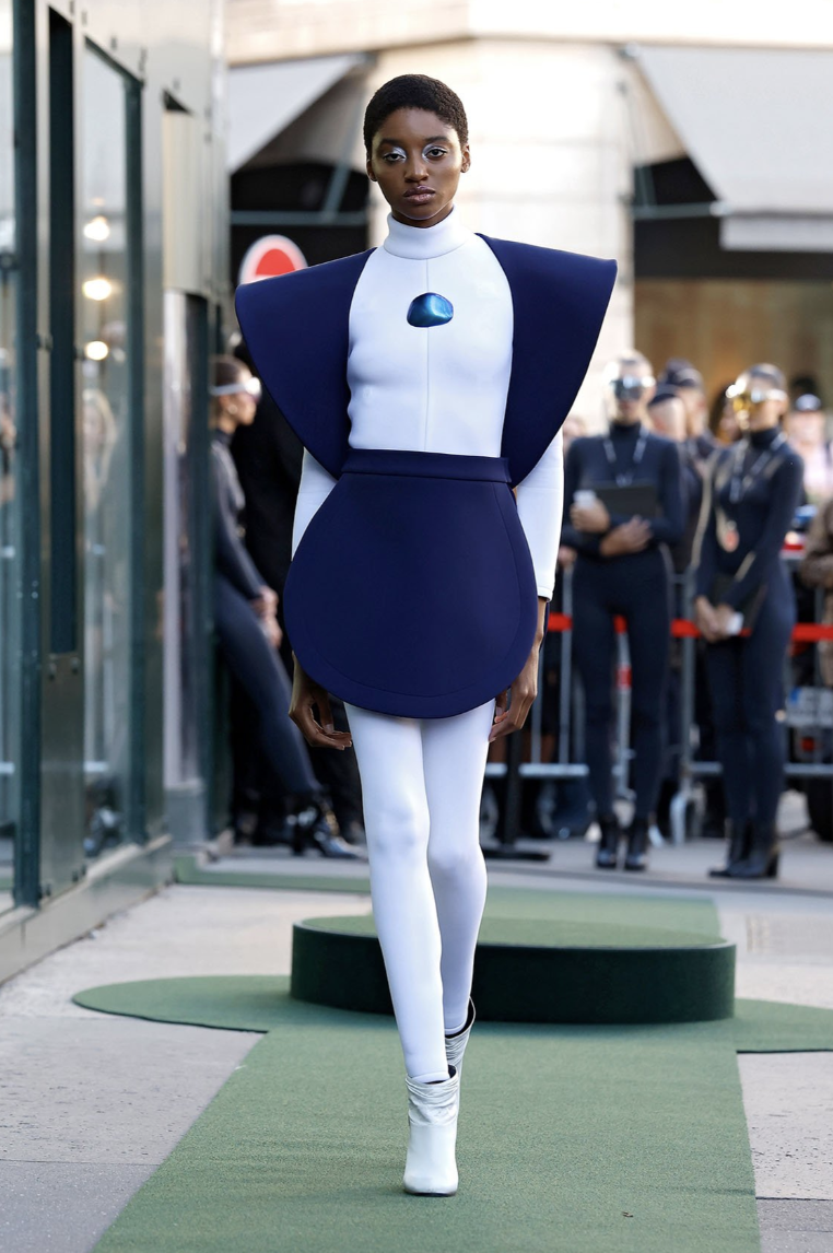 Las formas tubulares, los volúmenes exagerados en los hombros y las estructuras flotantes fueron un guiño a los archivos históricos de la casa, reinterpretados con un lenguaje contemporáneo. Esta colección no fue una simple propuesta de temporada, sino una declaración de principios sobre el poder del diseño como vehículo del futuro.