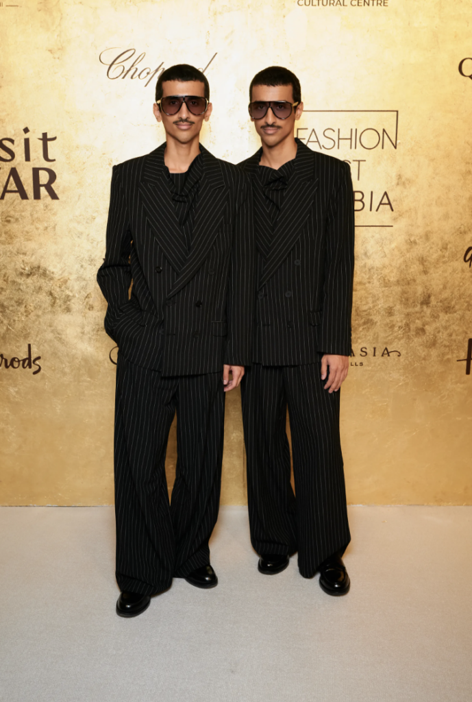 Los gemelos redefinieron la sastrería masculina con un enfoque oversize. Sus trajes negros, marcados por finas líneas blancas verticales y cortes amplios, se complementaron con gafas oscuras, proyectando una vibra futurista y cool.