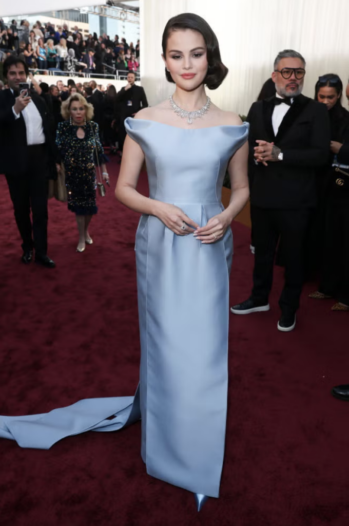 Selena Gomez deslumbró con un vestido columna personalizado de Prada que incluía detalles de falda estilo delantal. El diseño sobrio y sofisticado del vestido proyectaba un minimalismo elegante, mientras que las joyas de Tiffany & Co. aportaron un toque de lujo discreto que complementó a la perfección su look.