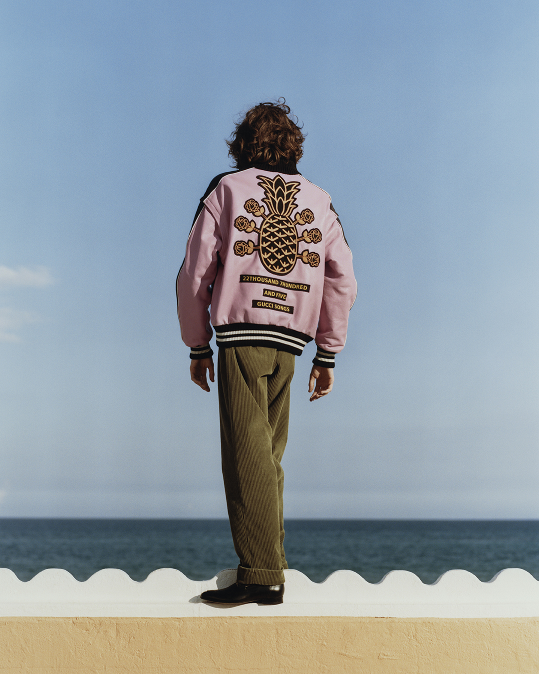 Las prendas ready-to-wear que van desde ropa formal hasta ropa deportiva de forro polar se enriquecen con un parche que lleva el número 22,705, el número de canciones que en su letra hacen alguna referencia a Gucci. Los tennis y los accesorios de piel complementan la selección, proponiendo el motivo de la piña en un estampado color amarillo brillante que destaca sobre la base de tela GG Supreme. Los tennis y los accesorios de piel complementan el look, ademas de El Screener, el Rython y el Gucci Basket proponen un motivo estampado de rosas y piñas en color amarillo brillante, creando un contraste atrevido con la base del lienzo GG Supreme.
