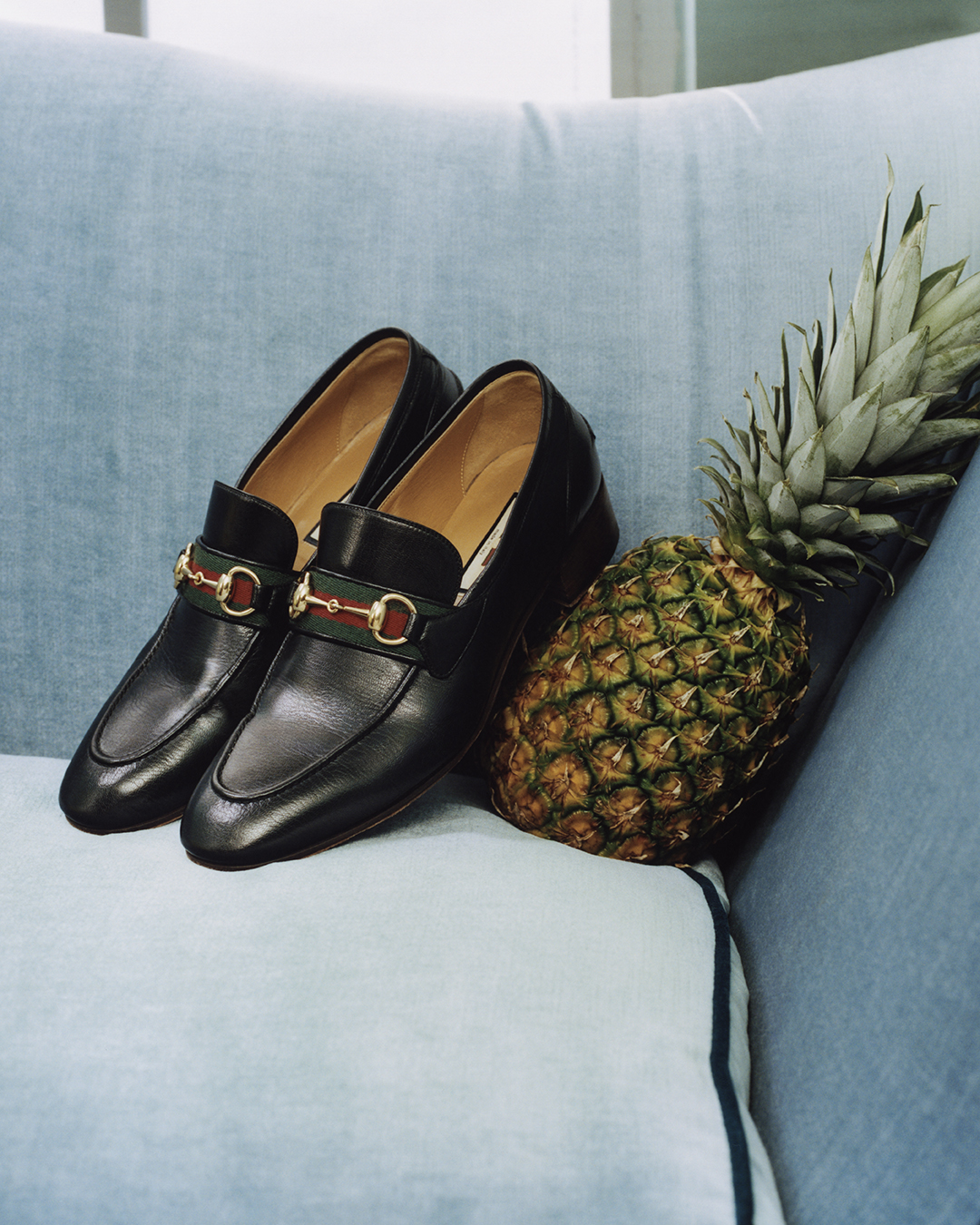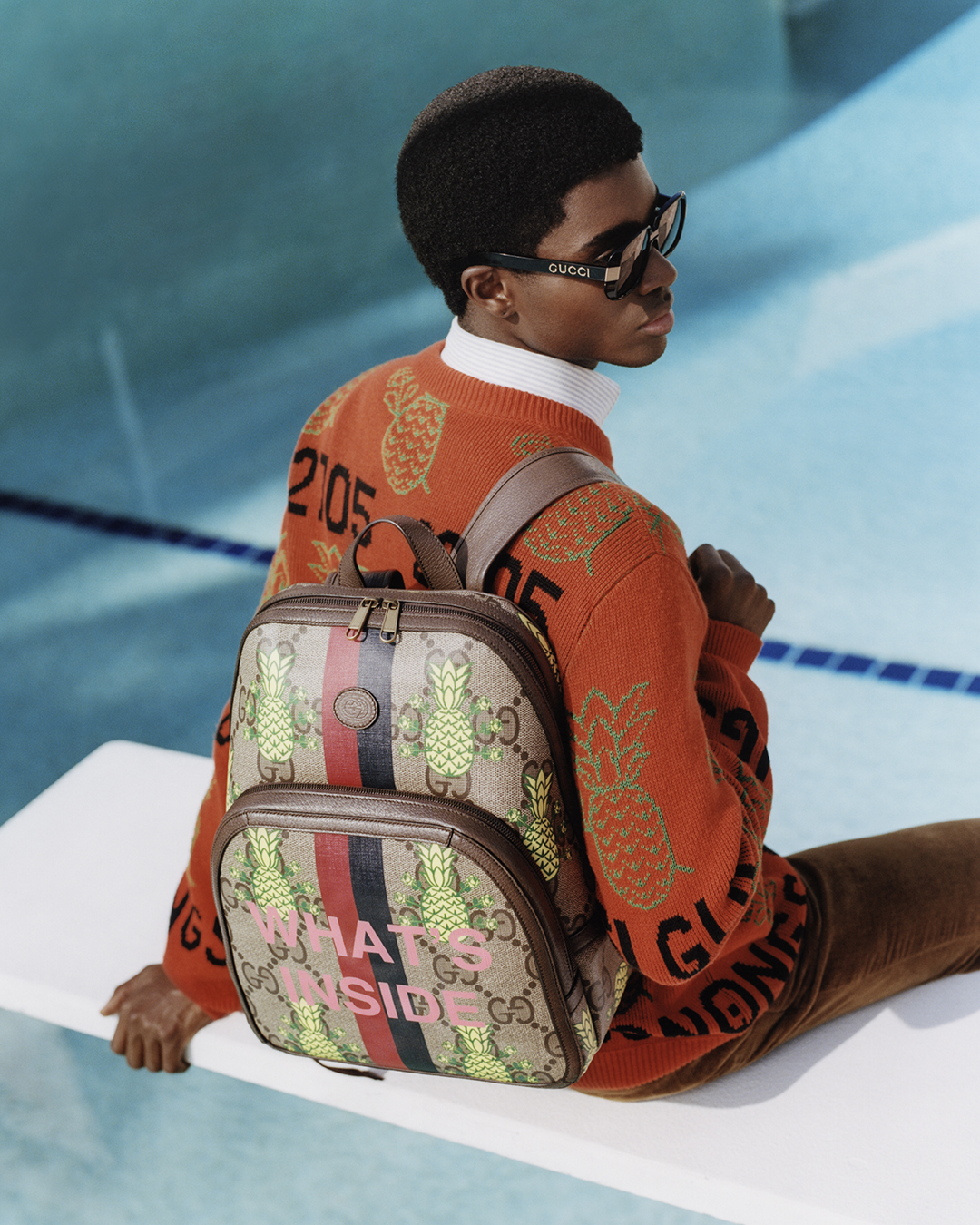 La colección Gucci Pineapple se presenta mediante una campaña vibrante y alegre capturada en el lugar favorito del jet-set para una escapada invernal: The Colony Hotel en Palm Beach. Los protagonistas se presentan con un ánimo relajado y mimetizado con el tranquilo ambiente y de vivos colores. En contraste con los diseños atrevidos retro de la escapada de playa, las imágenes y los videos adquieren una calidad vintage que hace eco del juego atemporal de la colección.