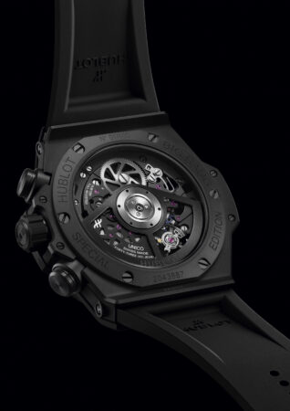 Esta edición es el primer Big Bang Unico All Black de 42 mm con una esfera realizada íntegramente en zafiro y cuenta con un estilizado motivo de calavera en el centro.