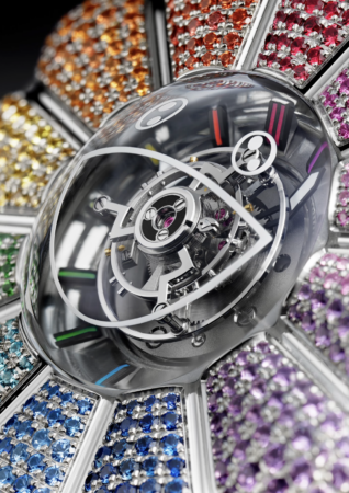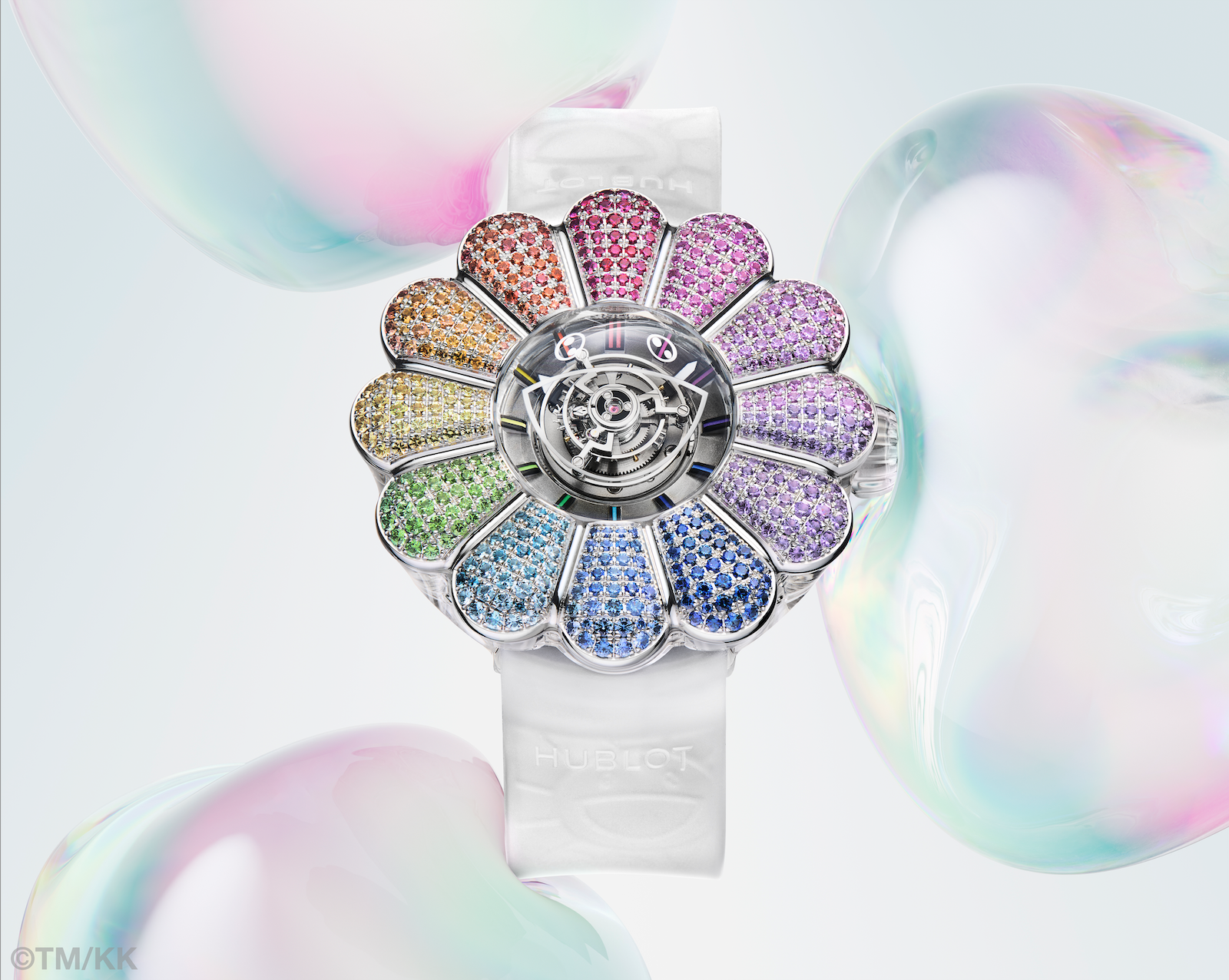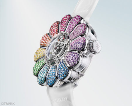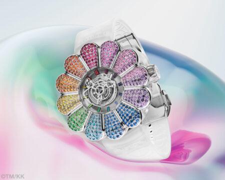 Con un diseño que desafía las normas, la caja de este reloj se talla a partir de un bloque sólido de cristal de zafiro, dándole una transparencia mística que destaca en cualquier muñeca. La pieza cuenta con 12 pétalos engastados con 444 piedras preciosas, que van desde rubíes hasta zafiros en tonalidades azul y naranja. Cada pétalo tiene un color vibrante, evocando la paleta cromática distintiva de Murakami, y crea una armonía visual digna de un arcoíris.