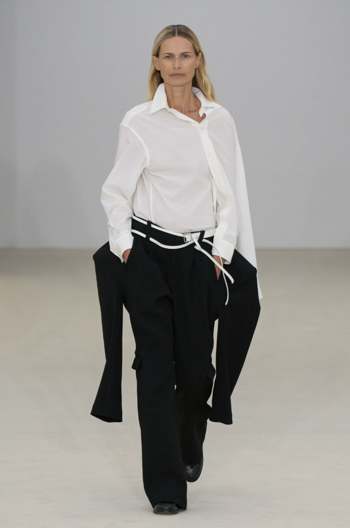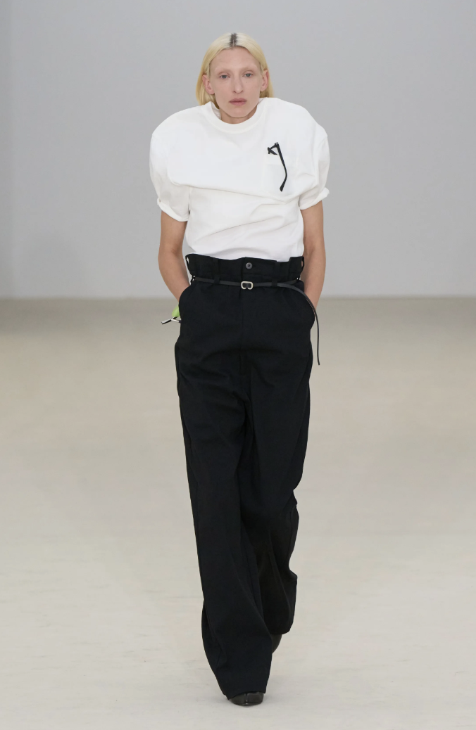 Las siluetas juegan con lo desestructurado. Sobresalen chaquetas deconstruidas que parecen fragmentarse en capas asimétricas, pantalones amplios que rozan lo escultórico y camisas que desafían el convencionalismo con mangas o proporciones alteradas.