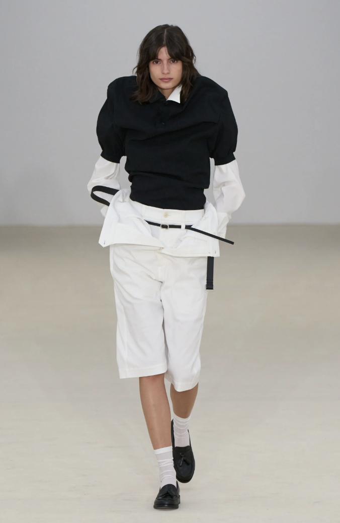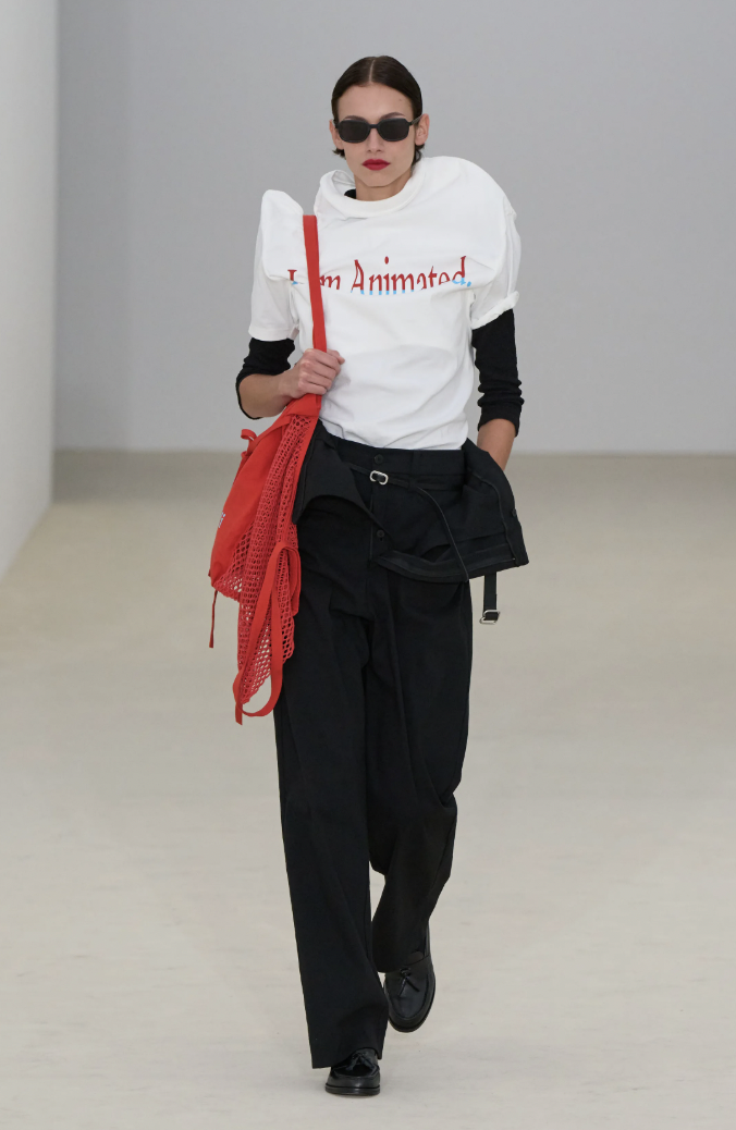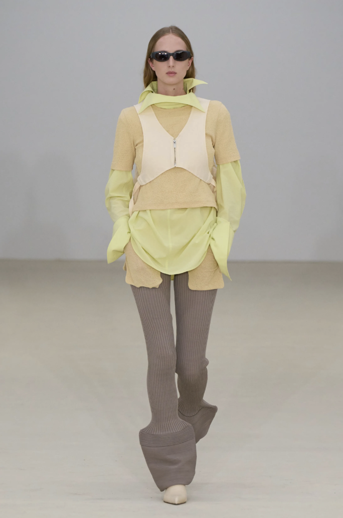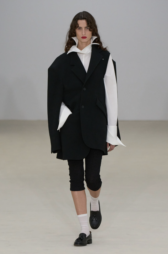 Los accesorios se convierten en extensiones de la narrativa. Lentes angulares en tonos oscuros, cinturones que marcan la cintura de forma gráfica y calcetería que se funde con el calzado aportan un aire futurista. Todo ello potencia una estética que oscila entre la elegancia minimal y un gesto irreverente hacia el vestir tradicional.