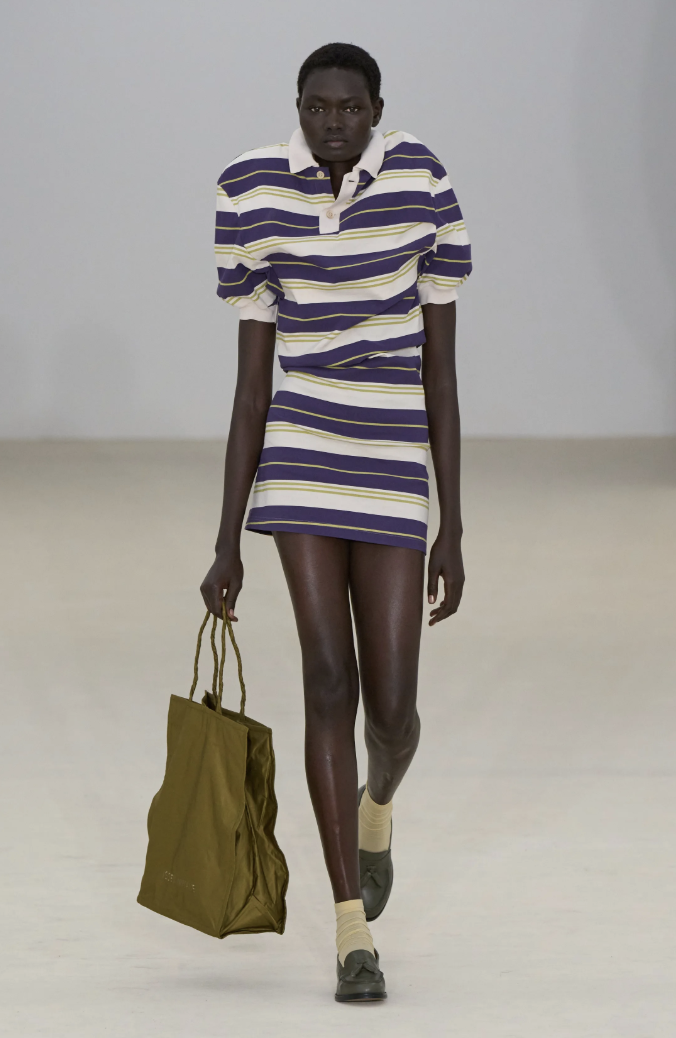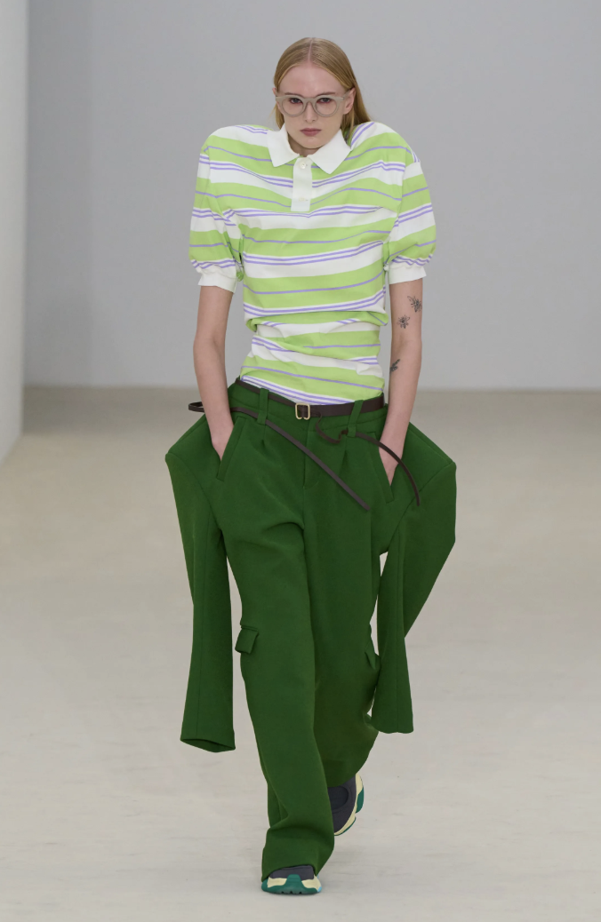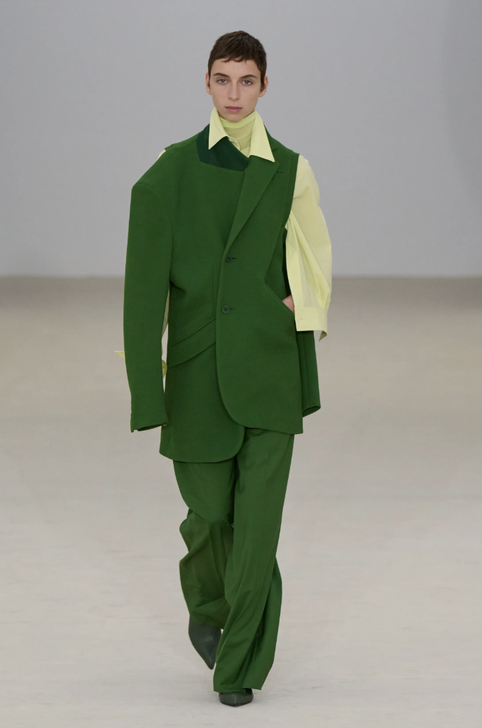 El rosa pastel se funde con tonos violeta profundo para crear contrastes que transmiten energía sin abandonar la elegancia. A su vez, el verde en diferentes gamas se convierte en protagonista, ya sea en trajes deconstruidos con proporciones sobredimensionadas o en pantalones de caída amplia que se mueven con soltura. Los blancos aparecen como pausas estratégicas que iluminan la narrativa, mientras que destellos de rojo inyectan fuerza y tensión dramática.