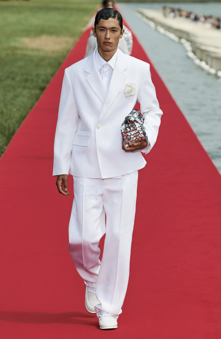 Además el desfile tomó un giro innovador cuando los invitados, incluidas celebridades notables e influenciadores como Emily Ratajkowski, Arón Piper, la pareja Beckham, Eva Longoria, India Amarteifio y Manu Ríos, observaron la pasarela desde botes en las orillas del palacio.