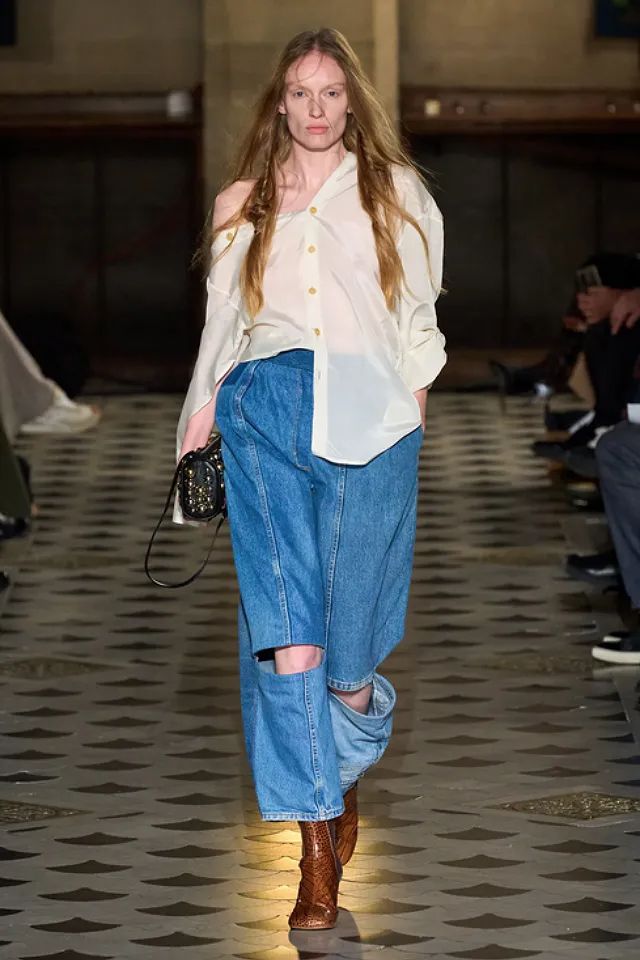 El lavado también marca una diferencia clara. Predominan los azules medios, los índigo profundos y los negros suavemente tratados. Tonos que permiten que la rotura se lea como una decisión de diseño y no como un accidente. Incluso el denim blanco y crudo entra en escena, siempre que el desgaste sea mínimo y cuidadosamente ubicado.