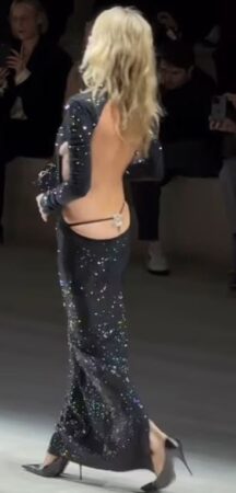 El vestido podía parecer conservador visto de frente, pero la espalda tenía una sorpresa con un escote que le llegaba hasta los glúteos y dejaba ver una tanga negra con el brillante logo de Gucci.