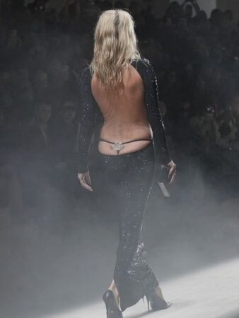 Kate Moss hizo una aparición atrevida en la Semana de la Moda de Milán. La supermodelo británica de 52 años regresó a la pasarela este viernes 27 de febrero, para desfilar para Gucci con un vestido muy escotado. Kate lució su característico movimiento con un brillante vestido negro de cuello alto y mangas largas.