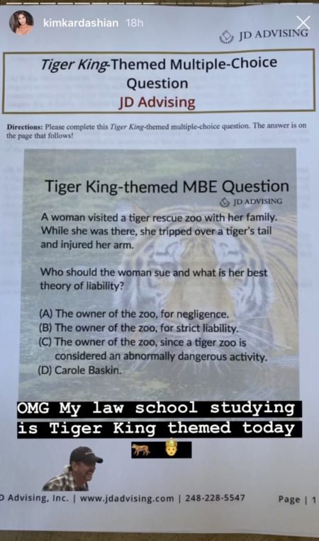 Ahora la nueva noticia es que la estrella de Keeping Up with the Kardashians estudia para el Bar Exam —la prueba más importante que un abogado necesita aprobar— y lo está haciendo con ayuda de Tiger King. “Una mujer visitó un zoológico de rescate de tigres con su familia. Estando ahí, se tropezó con la cola de un tigre y se lastimó el brazo. ¿A quién debería demandar y cuál sería la mejor teoría a su favor?”, dice el quiz que compartió Kim en Instagram Stories.