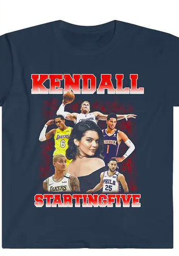 La t-shirt en cuestión tiene una foto de primer plano de Kendall rodeada por sus ex novios basquetbolistas: Jordan Clarkson, Blake Griffin, Ben Simmons, Kyle Kuzma y Devin Booker. La prenda también tiene el texto “Kendall Starting Five” al frente.