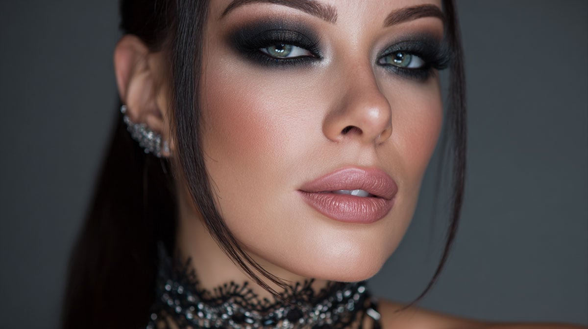 Combinar sombra carbón con un toque metálico en el centro del párpado crea dimensión. Aplica sombra gris carbón en la cuenca y párpado móvil, difuminando los bordes. Con un pincel más pequeño, deposita un tono plateado o gris metálico en el centro del párpado para obtener reflejos sutiles. Termina con una máscara de pestañas negra bien definida.