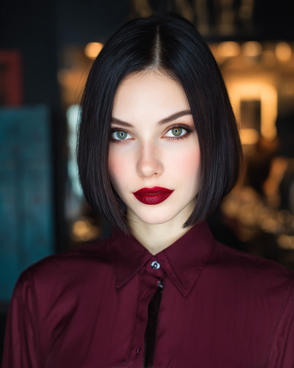 Un peinado que acompaña perfectamente maquillajes góticos más marcados es el cabello completamente lacio con raya al centro bien definida. Para conseguir este acabado, lava y acondiciona bien el cabello. Aplica un protector térmico y plancha en secciones finas. Usa un peine de cola para marcar la raya al centro con precisión. Finaliza con un poco de suero o aceite ligero sobre medios y puntas para eliminar el frizz sin brillo excesivo.