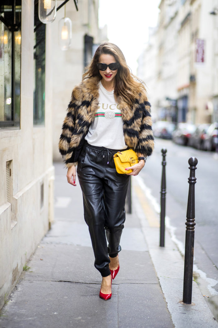 Con este outfit, Alexandra Lapp confirma por qué es una de las bloggers de moda favortitas. Para verte como ella, ponte una t-shirt fajada (obviamente con un logo) con unos pantalones de piel y no olvides darle ese toque de color con unos zapatos y un clutch en tonos primarios. El saco de fax fur es la cereza del pastel para verte fashion-glam.