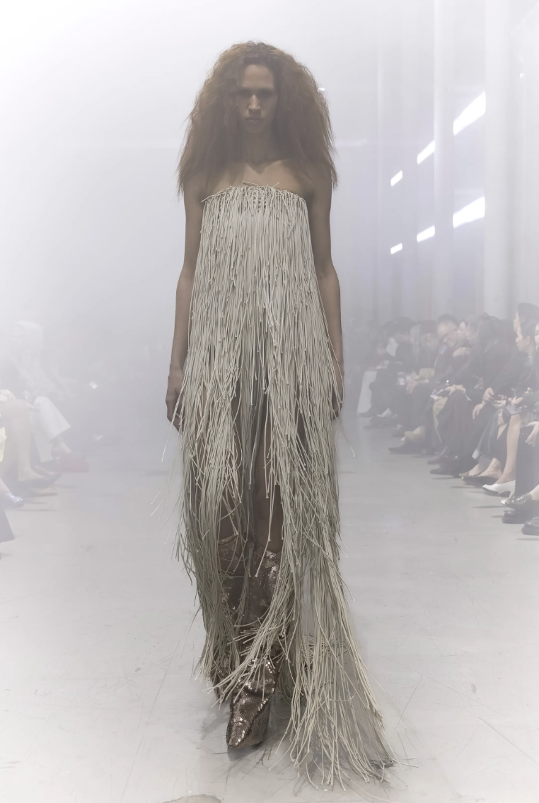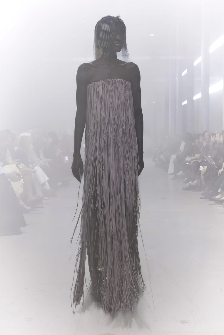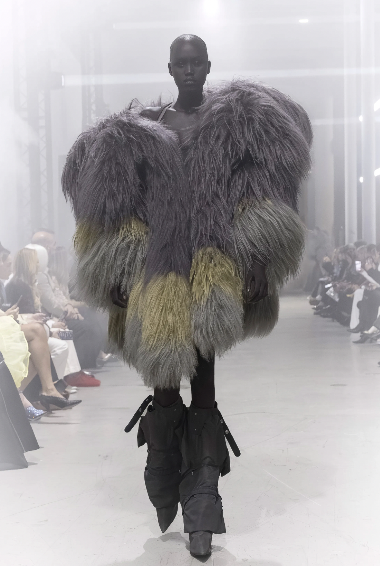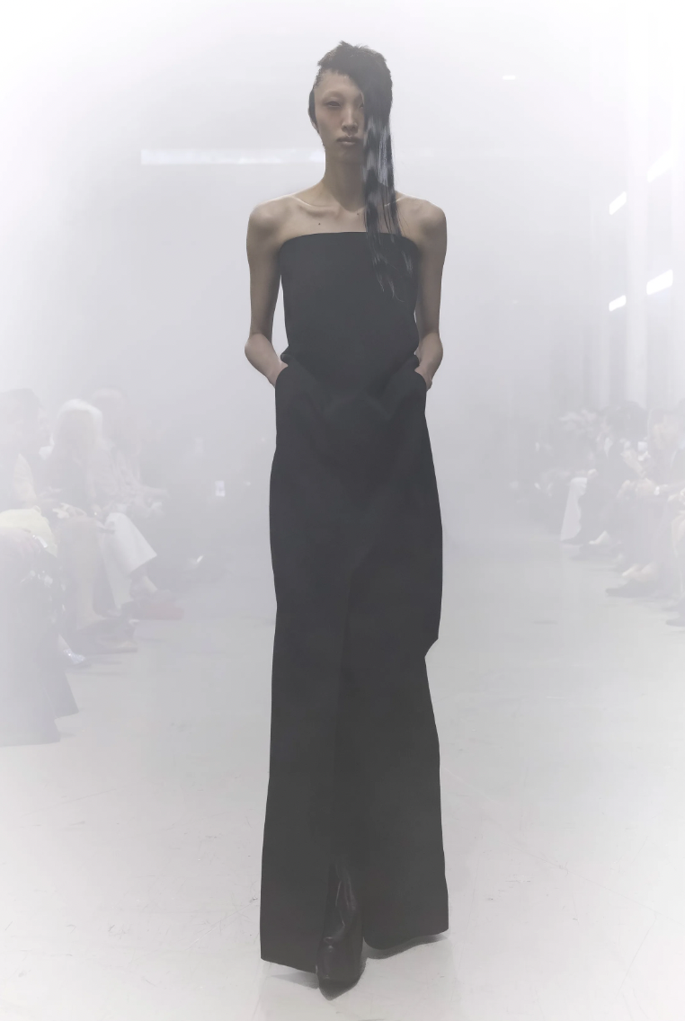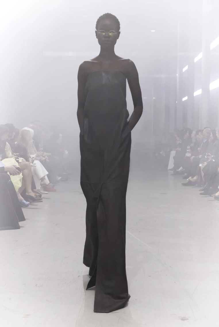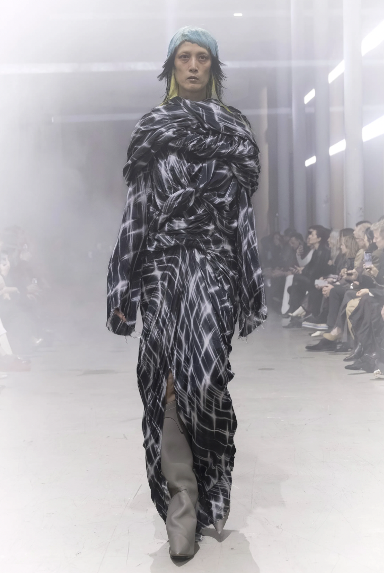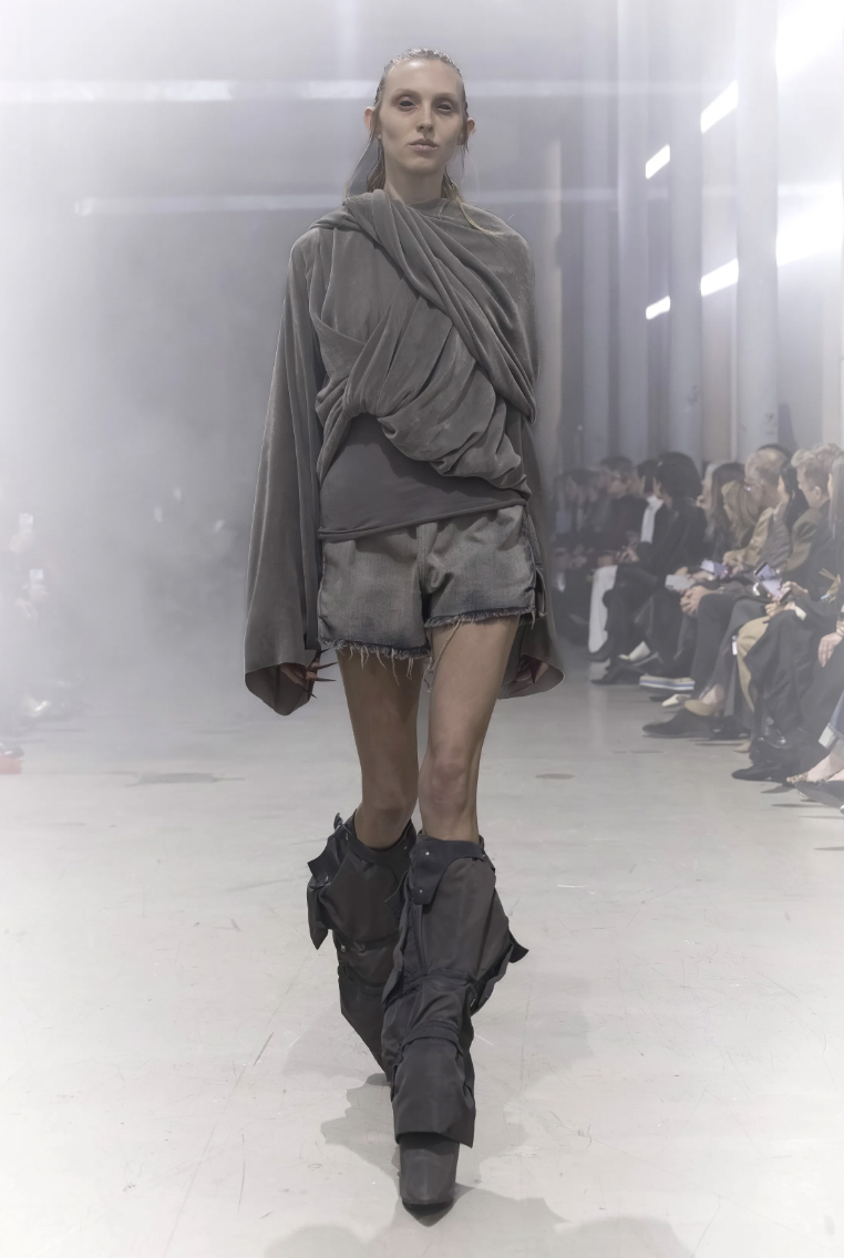 El primer enfoque de la colección se centra en prendas que swaddle o envuelven el torso de manera protectora. En lugar de líneas rectas y rígidas, Rick Owens apuesta por volúmenes que parecen esculpidos a mano, creando un capullo de tela que resguarda a quien lo viste.