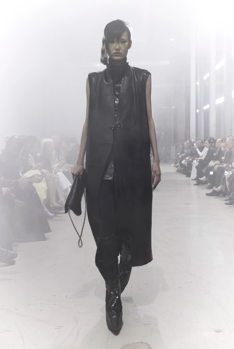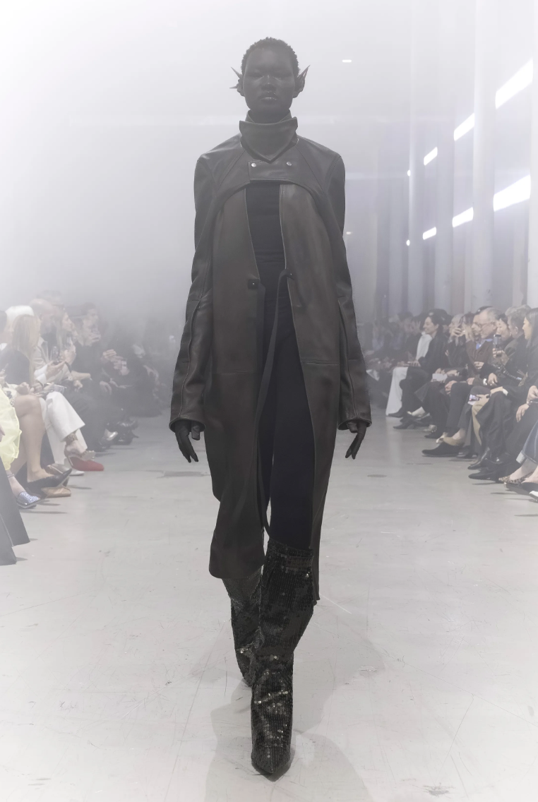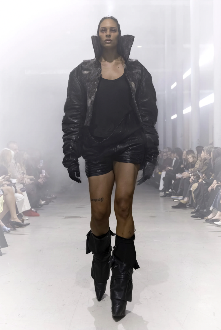 Este contraste entre lo utilitario y lo fetichista es la firma inconfundible de Rick Owens. Estas piezas no solo completan el look, sino que actúan como pedestales que otorgan una estatura heroica a sus musas, fusionando la practicidad necesaria para la supervivencia con el drama de la alta moda.