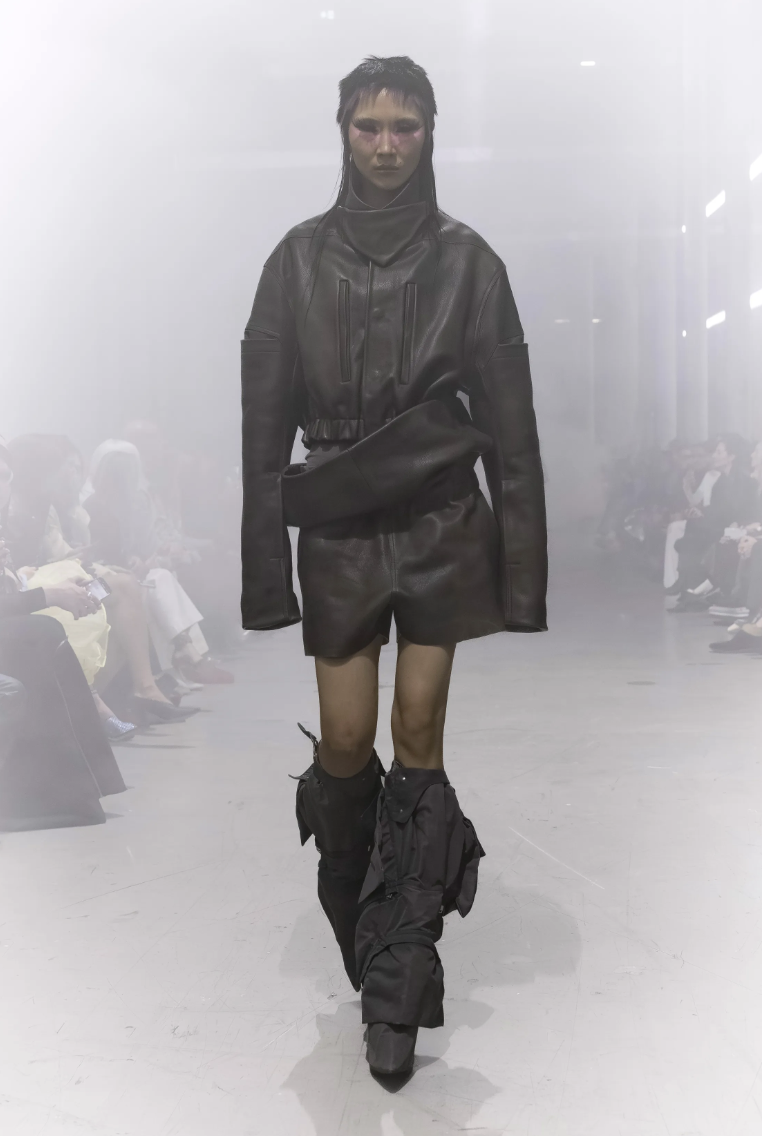 Owens introduce una serie de conjuntos que sugieren una funcionalidad extrema llevada al límite del arte. Las modelos desfilaron con una presencia imponente, luciendo shorts estructurados que reemplazan a las faldas cortas convencionales.
