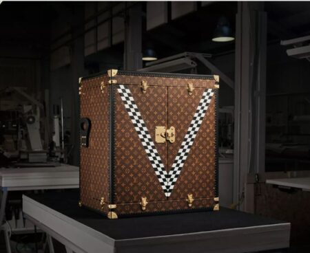 Está revestido de cuero negro por dentro para proteger el trofeo y el exterior está elaborado con ribetes de cuero y los clásicos protectores de esquinas en latón, cerradura y cierres que se han utilizado en este tipo de producto en Luis Vuitton desde 1860.