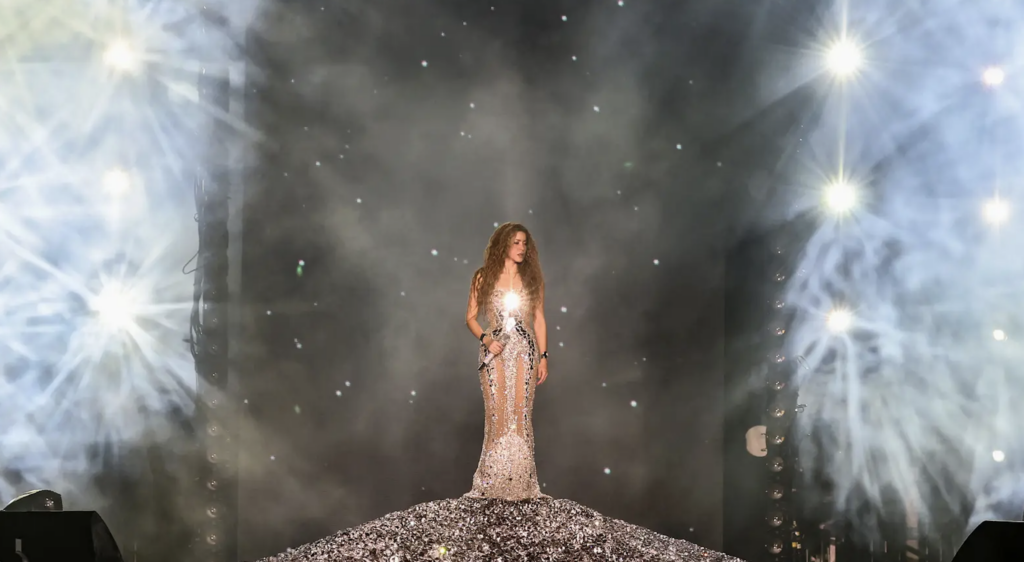 Para iniciar el concierto, Shakira eligió un conjunto que fusionaba elementos tradicionales colombianos con toques modernos, destacando su herencia cultural y energía característica.
