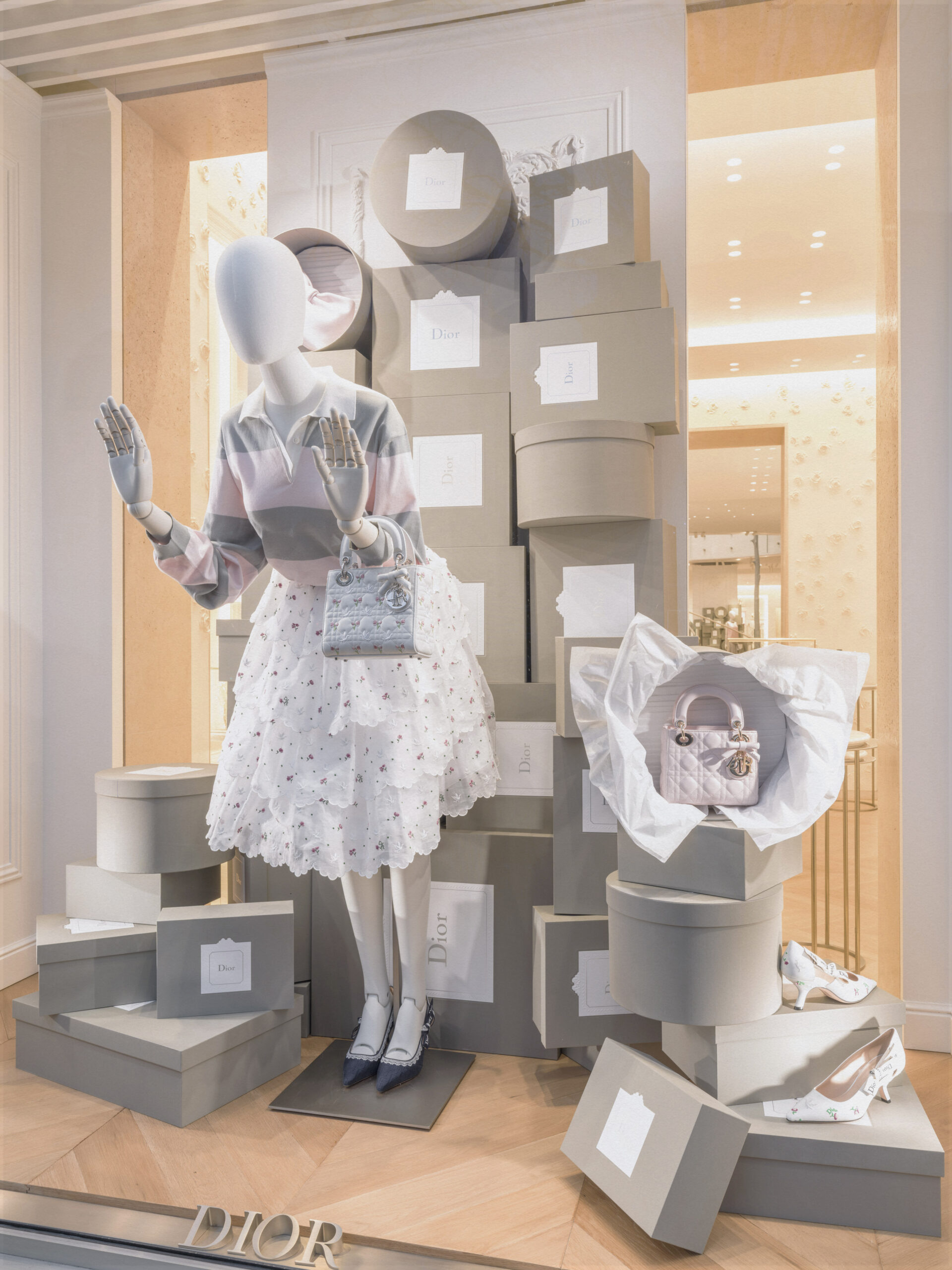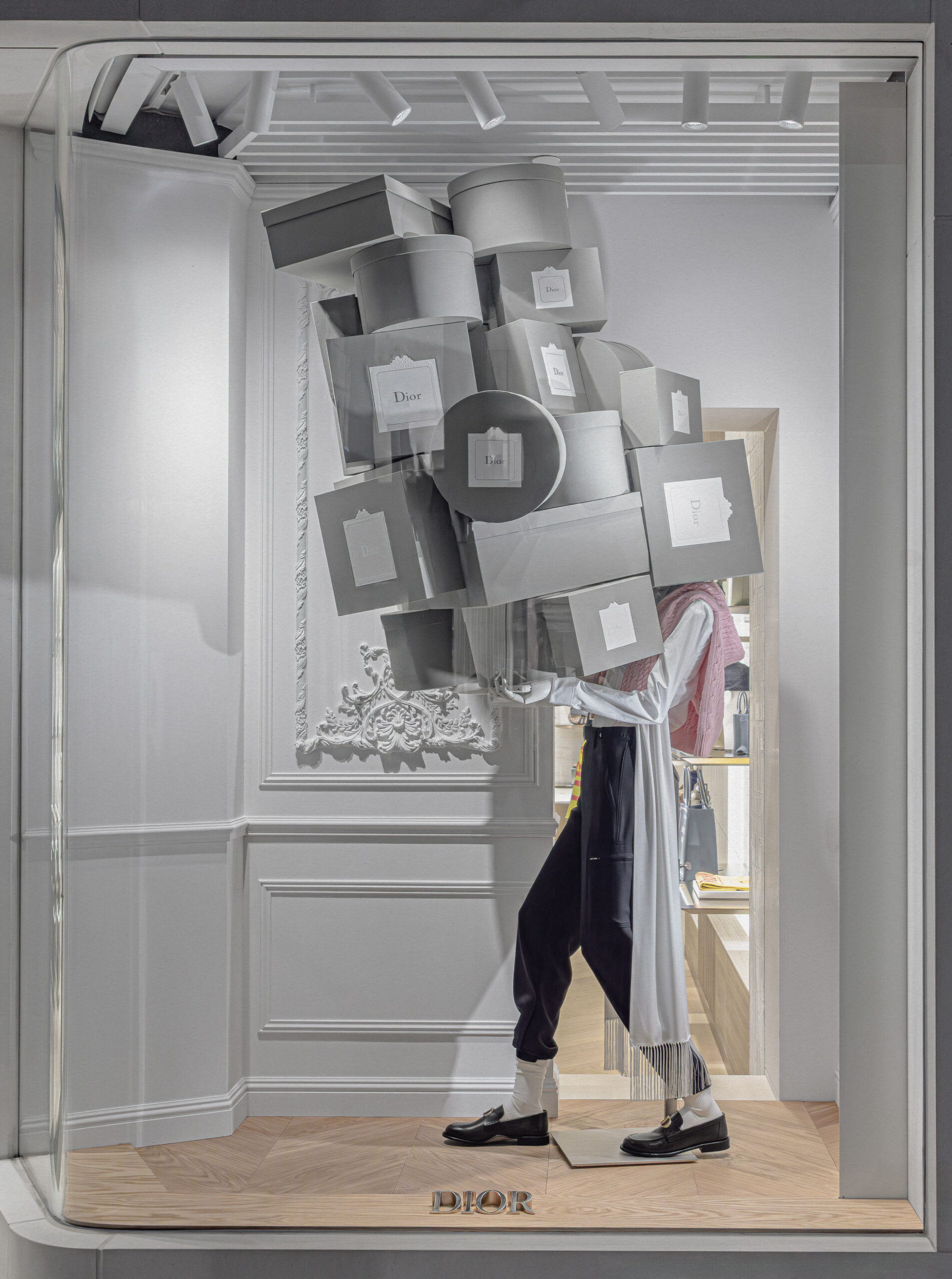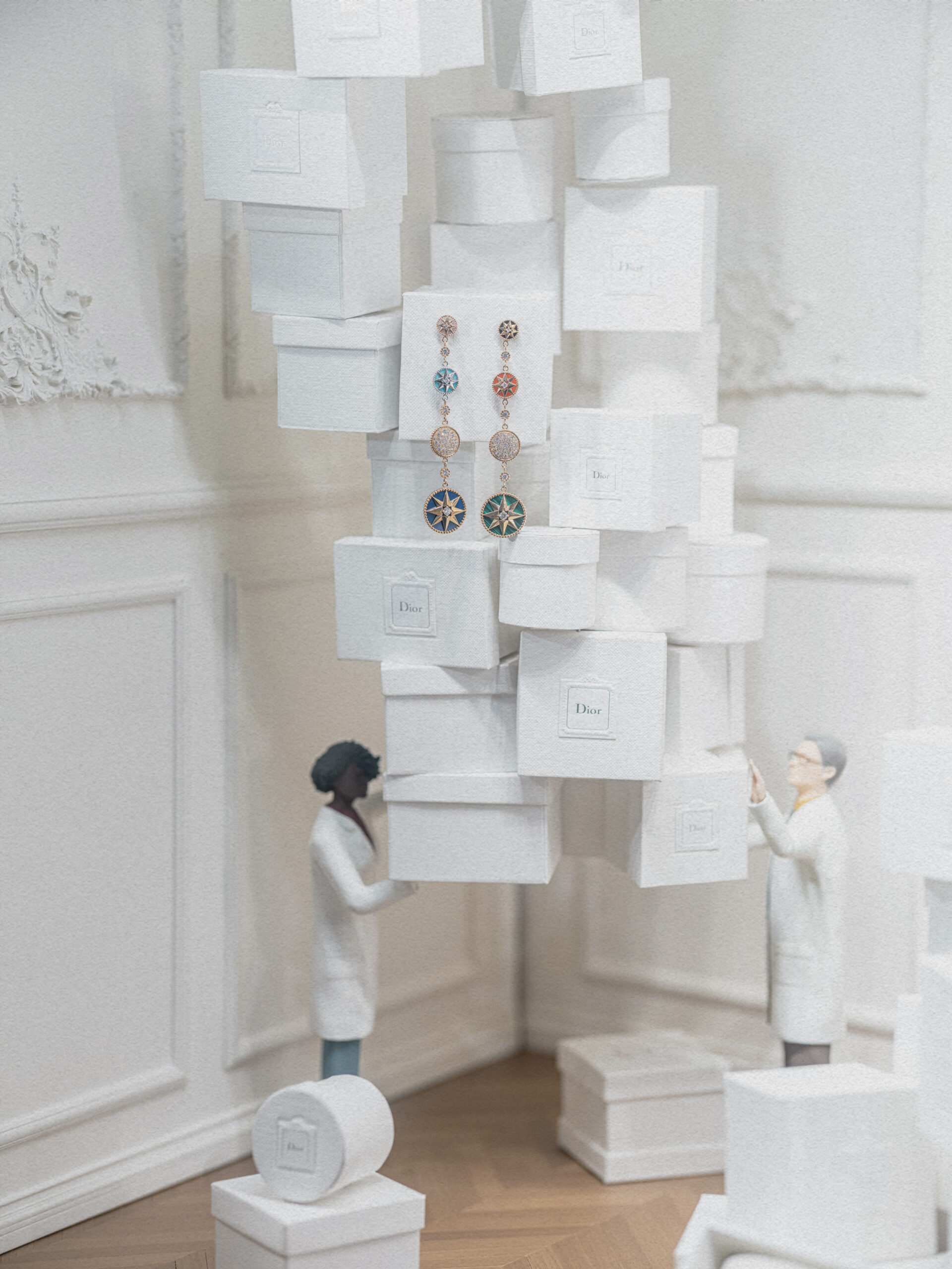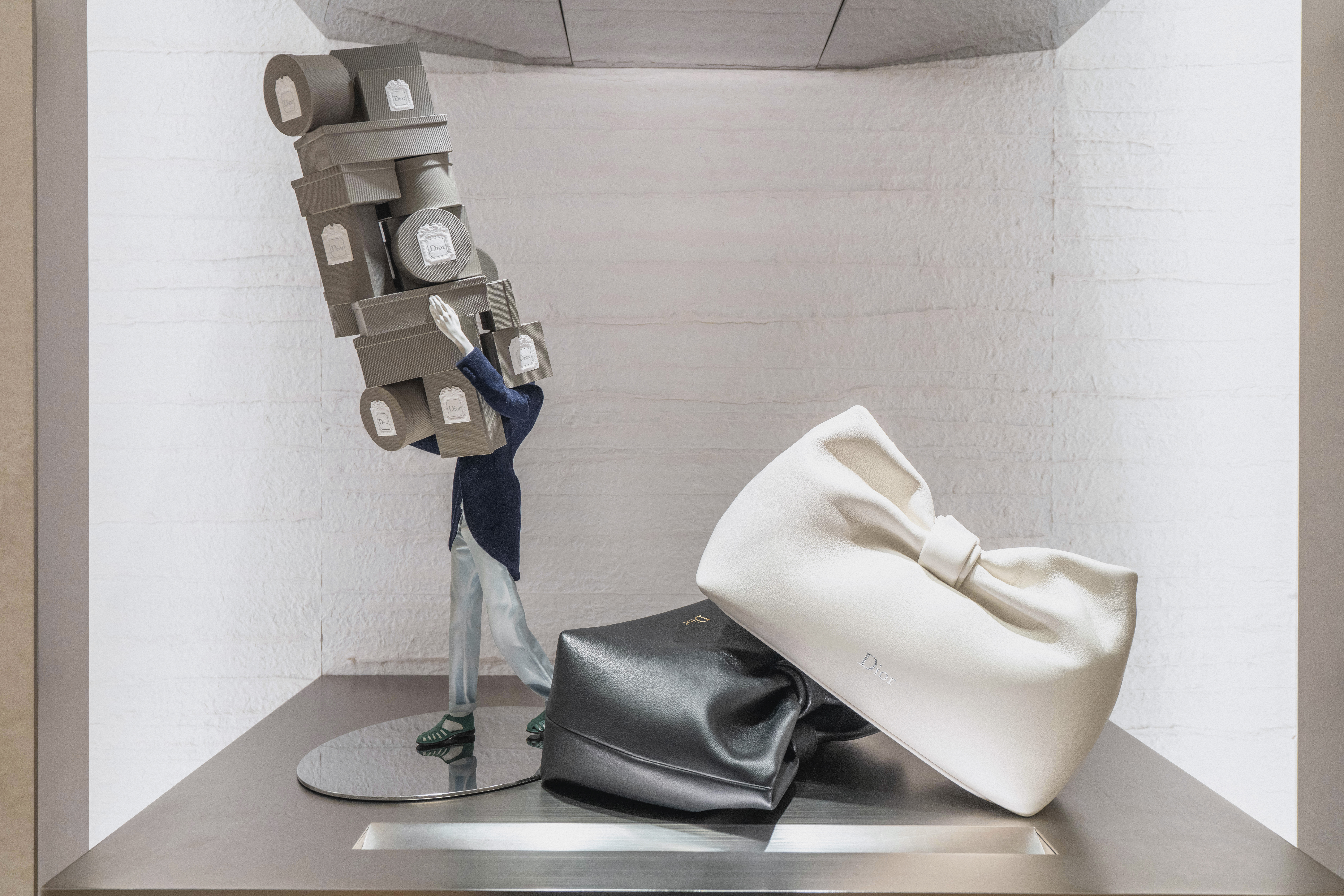 Un alegre homenaje a los archivos, escenografías inmersivas reinterpretan lúdicamente las cajas de la primera boutique de Dior, conocidas como Colifichets. Rindiendo homenaje al gris característico del 30 Montaigne, llenan el espacio, desbordándose en los escaparates o apiladas vertiginosamente, formando torres tambaleantes llevadas por traviesos botones que pretenden ser equilibristas.