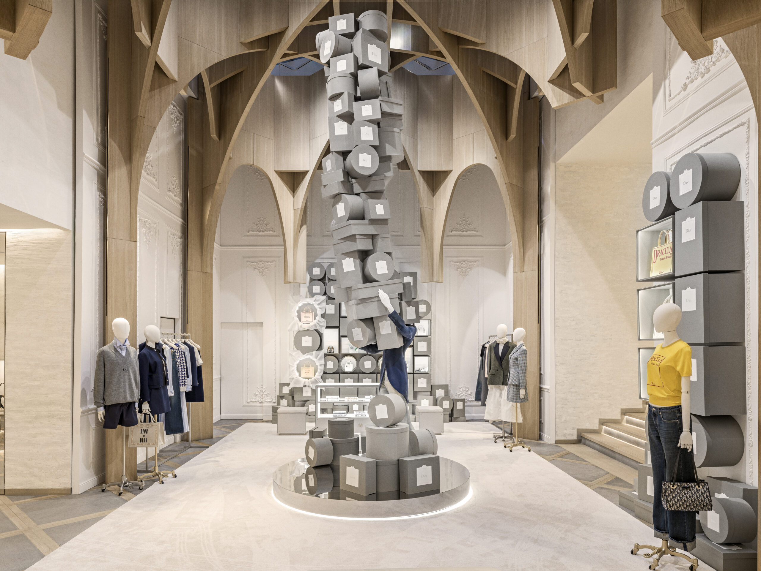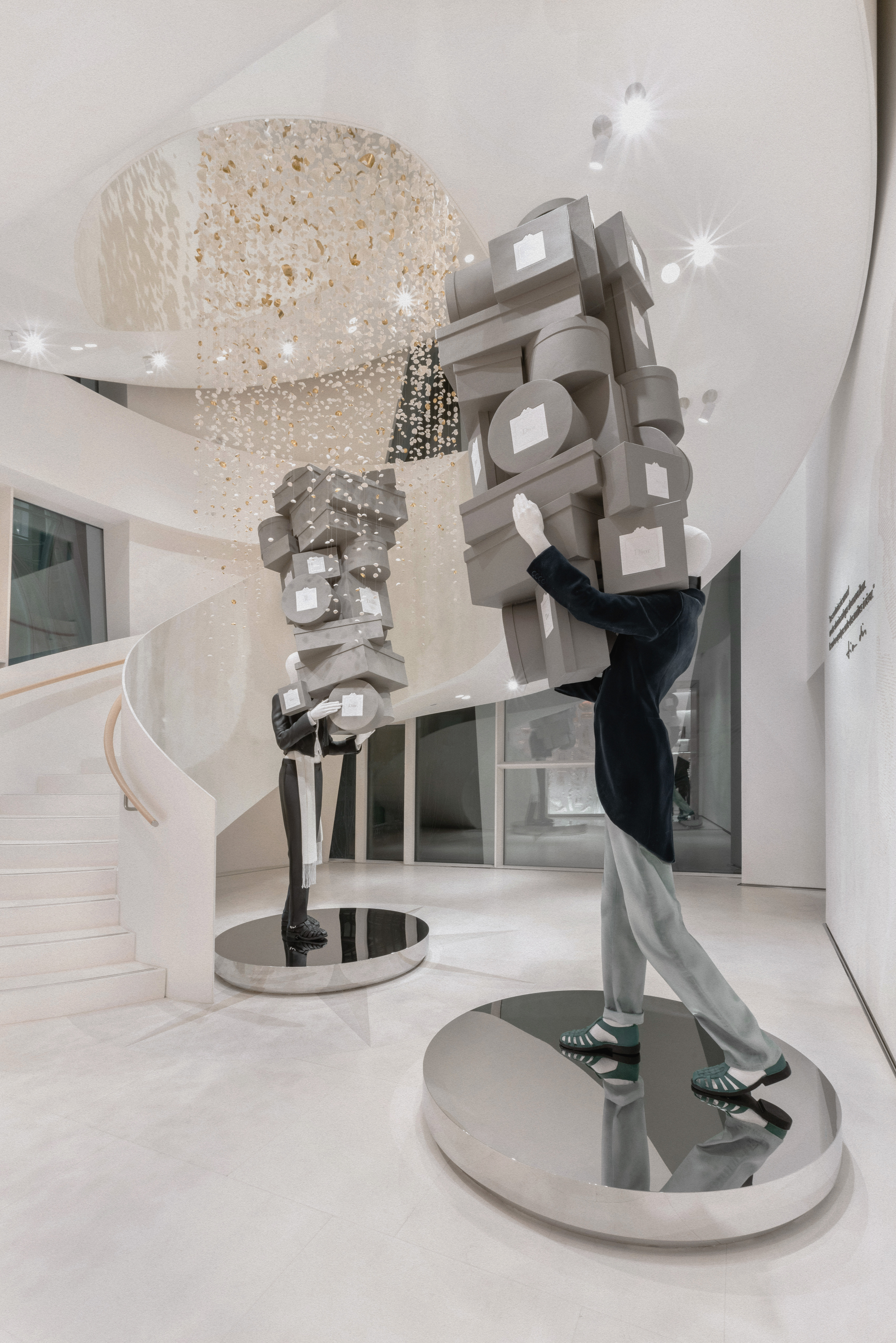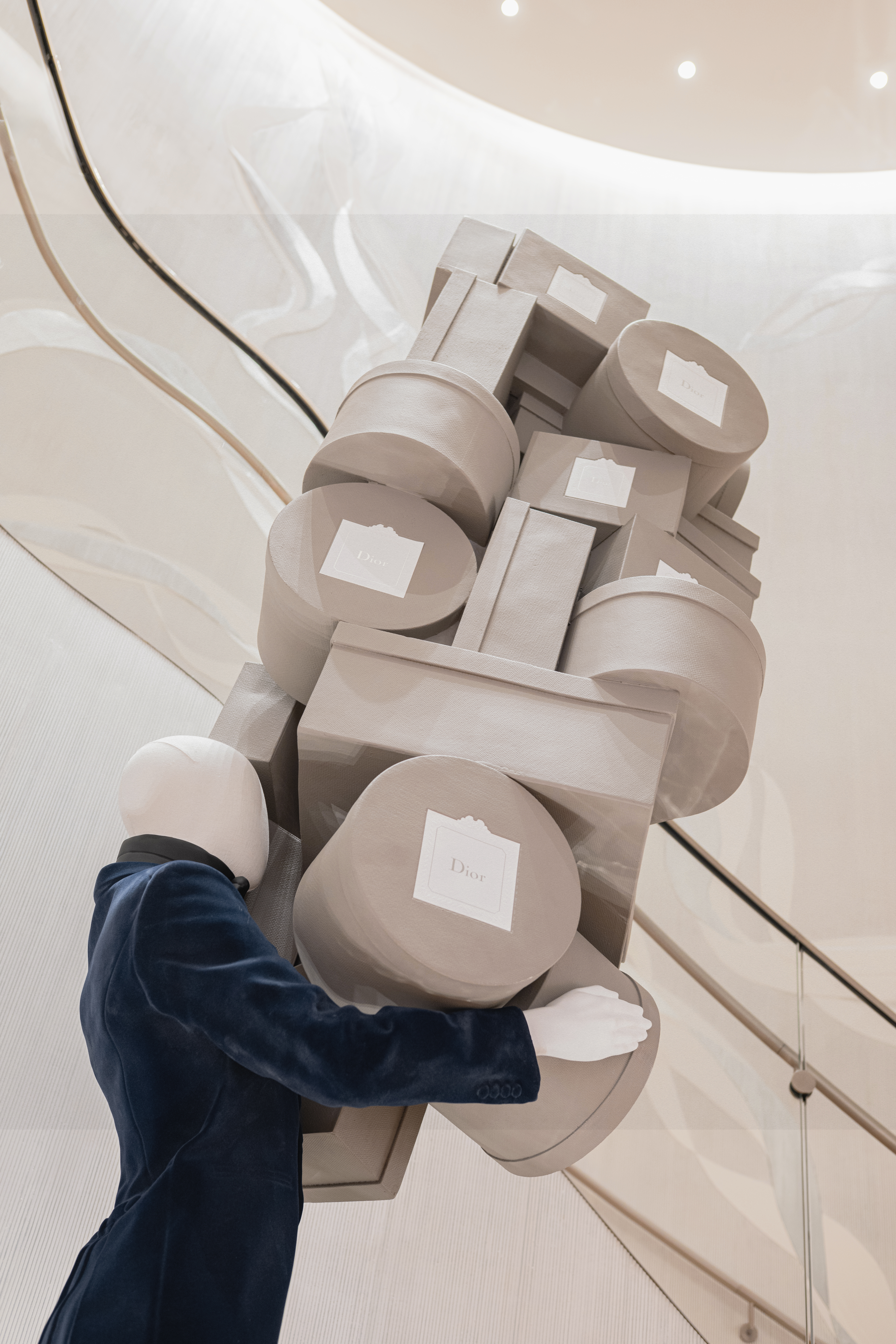 Un alegre homenaje a los archivos, escenografías inmersivas reinterpretan lúdicamente las cajas de la primera boutique de Dior, conocidas como Colifichets. Rindiendo homenaje al gris característico del 30 Montaigne, llenan el espacio, desbordándose en los escaparates o apiladas vertiginosamente, formando torres tambaleantes llevadas por traviesos botones que pretenden ser equilibristas.