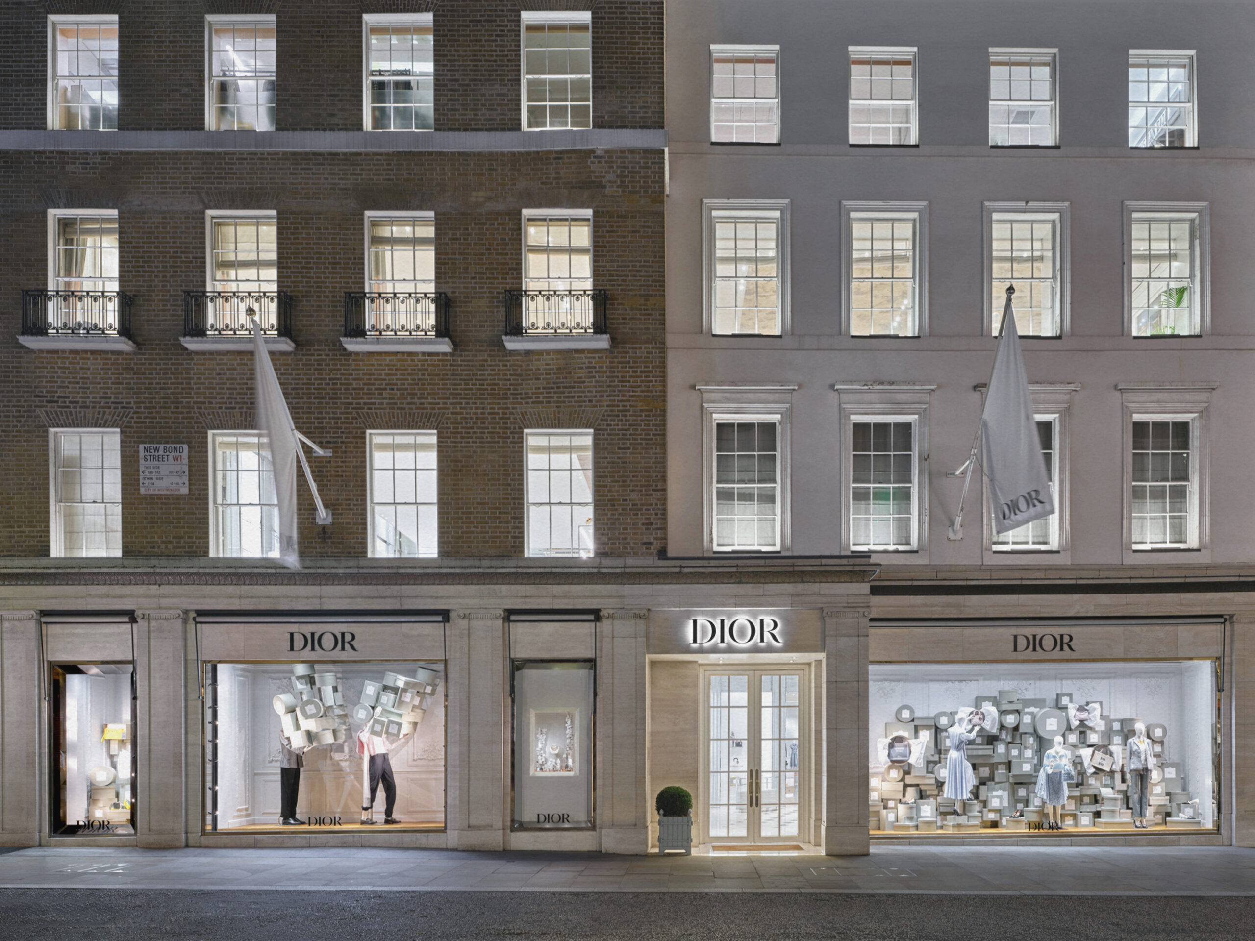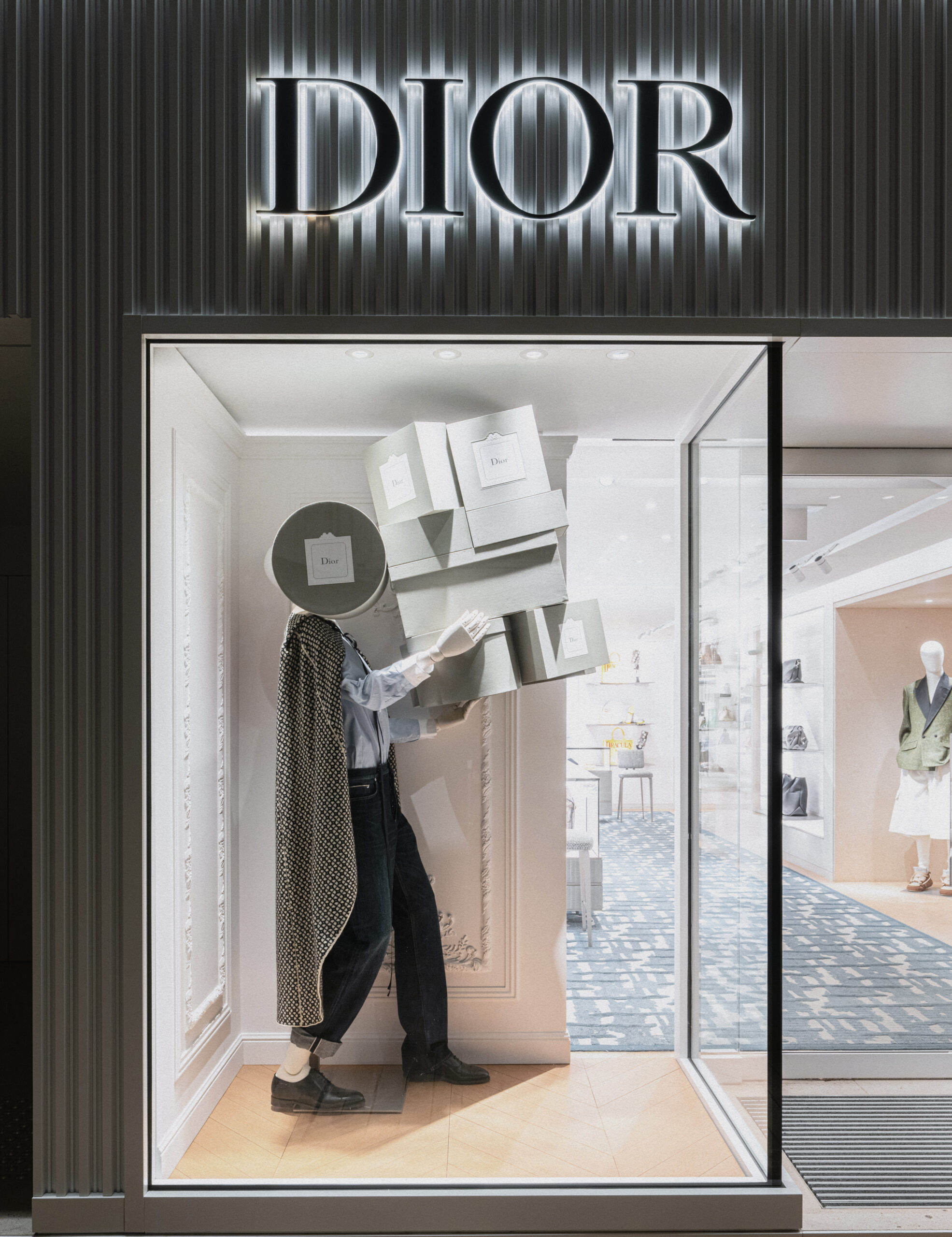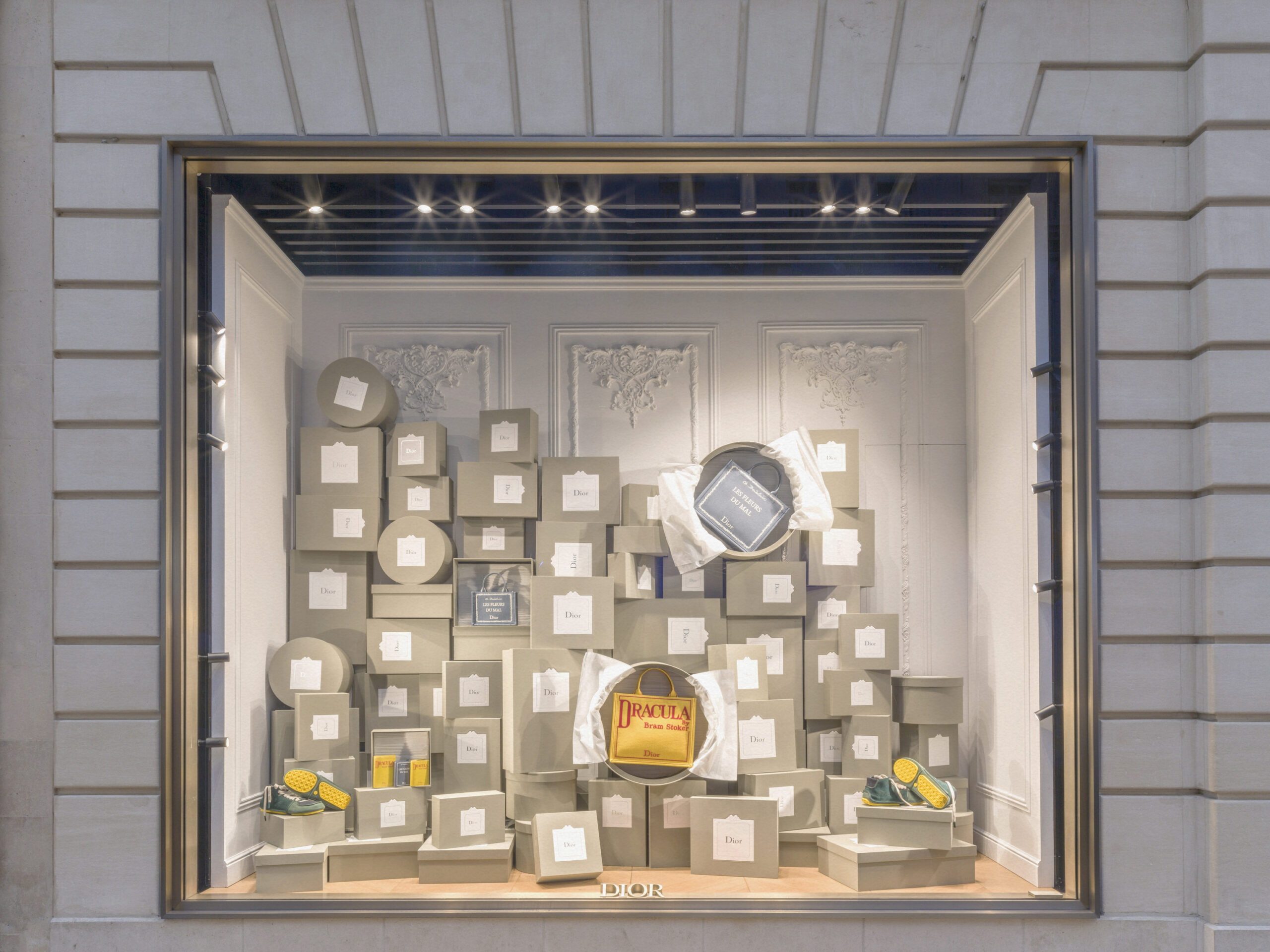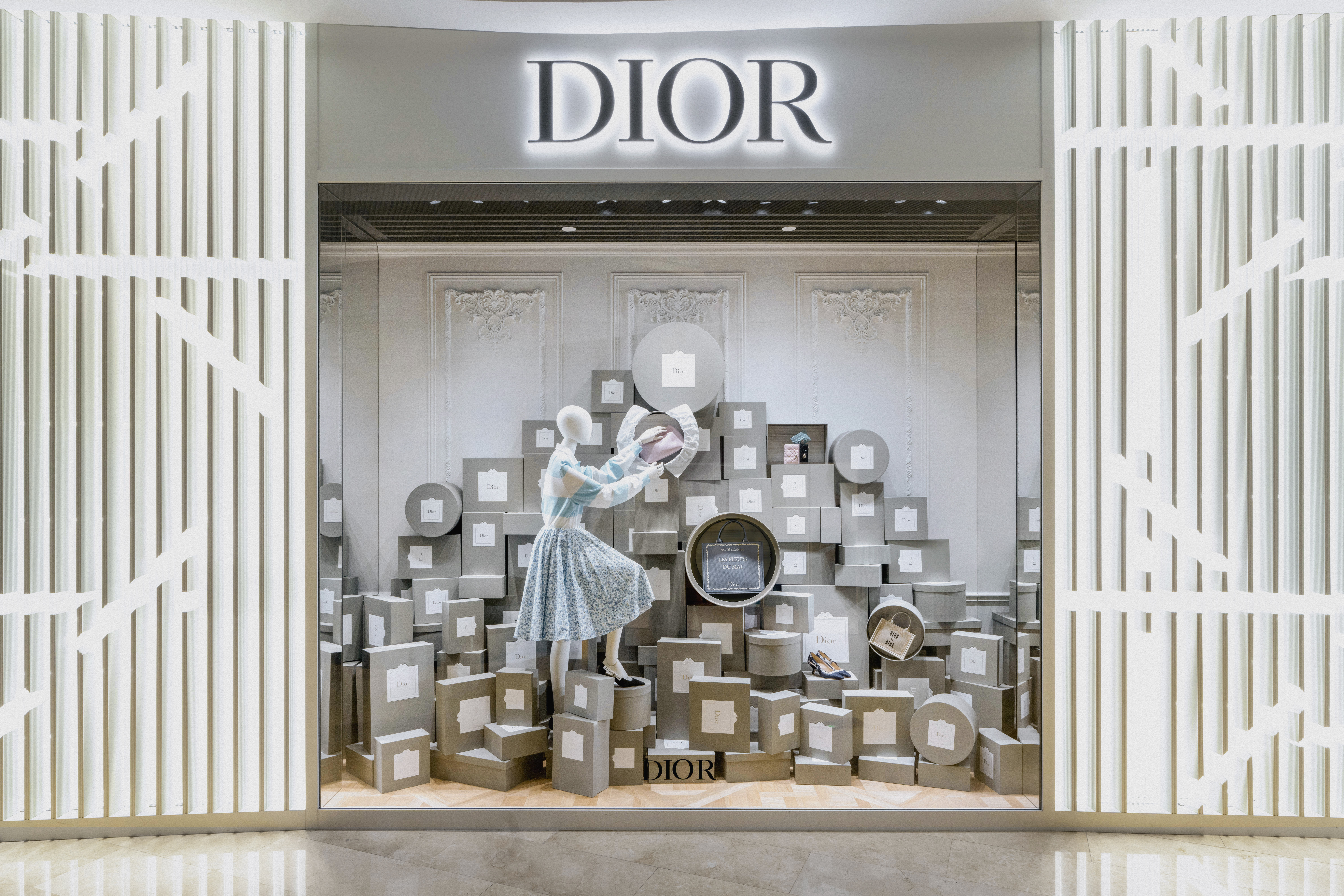 Un alegre homenaje a los archivos, escenografías inmersivas reinterpretan lúdicamente las cajas de la primera boutique de Dior, conocidas como Colifichets. Rindiendo homenaje al gris característico del 30 Montaigne, llenan el espacio, desbordándose en los escaparates o apiladas vertiginosamente, formando torres tambaleantes llevadas por traviesos botones que pretenden ser equilibristas.