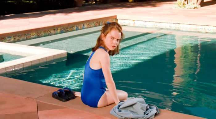 Tenemos que mencionar también la escena en la que Annie está en California a pie de la alberca en un traje de baño azul turquesa, una scrunchie, una tshirt oversized (estas niñas eran visionarias) y unas sandalias que, de nuevo, podrían ser de la colección de Birkenstocks de Céline o de Marni.
