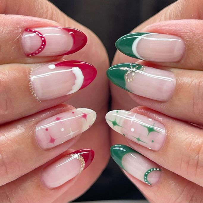 El clásico estilo francés se pone su ropa navideña. Las puntas se llevan en colores metálicos como dorado, plateado, rojo o verde esmeralda. También puedes probar con un acabado mate en la base o pequeños destellos de brillo en la línea divisoria.
