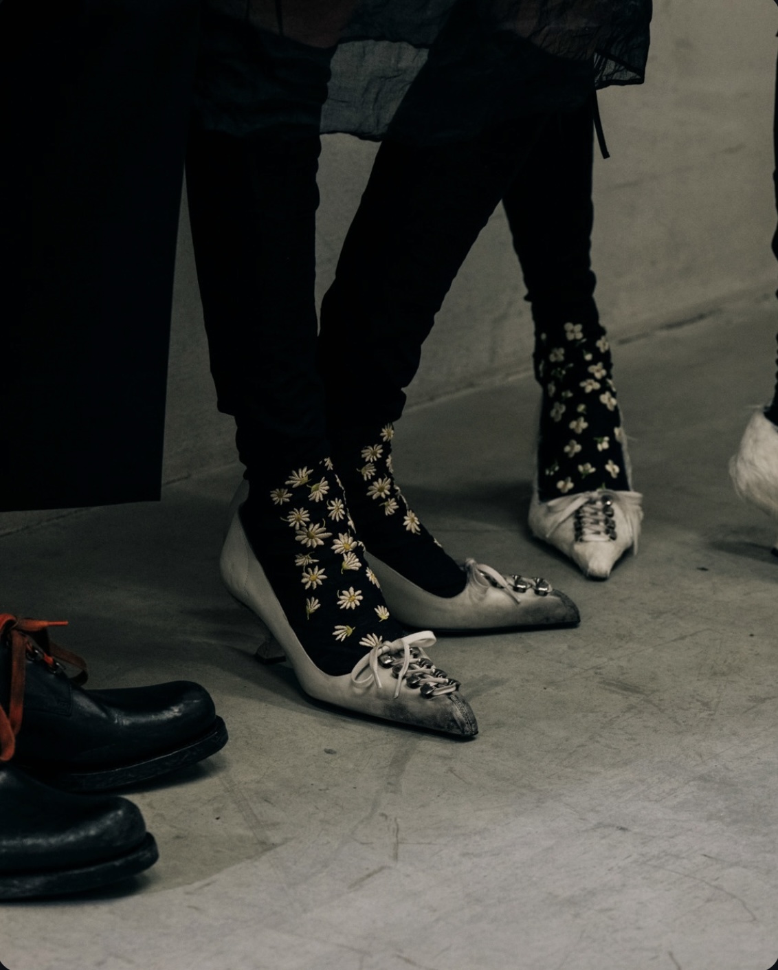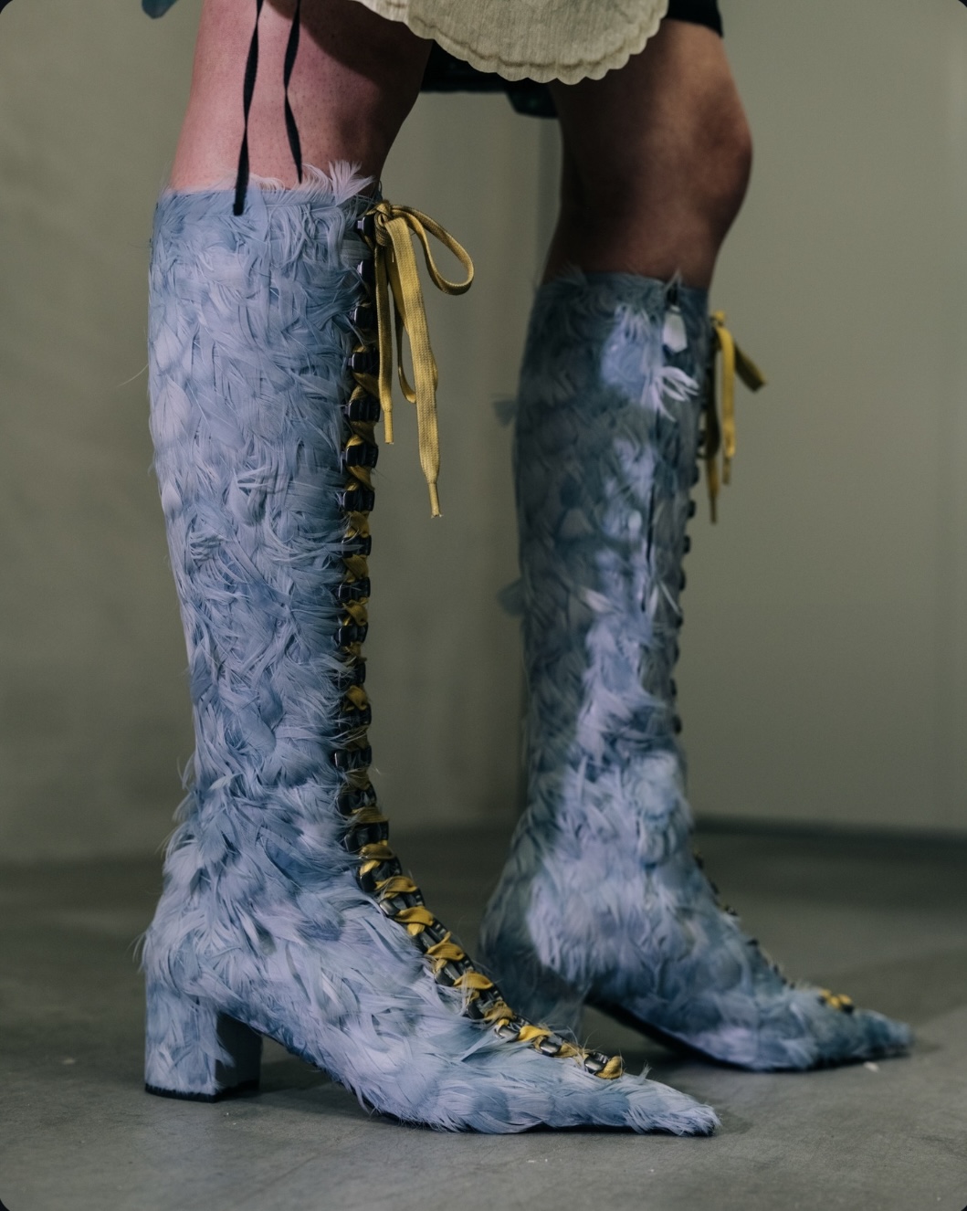 Los zapatos de este desfile, definitivamente es algo que tenemos que hablar, en especial las botas. Indiscutiblemente fueron mis piezas favoritas dentro de la colección de Prada. Hacen referencia a los años 2000, puntas afiladas, algunas con pedrería y deshilados, elevan el sabor del look, convirtiendo el calzado en una joya que ya tiene un lugar dentro de las piezas icónicas de la temporada Otoño/Invierno de la Semana de la Moda de Milán.
