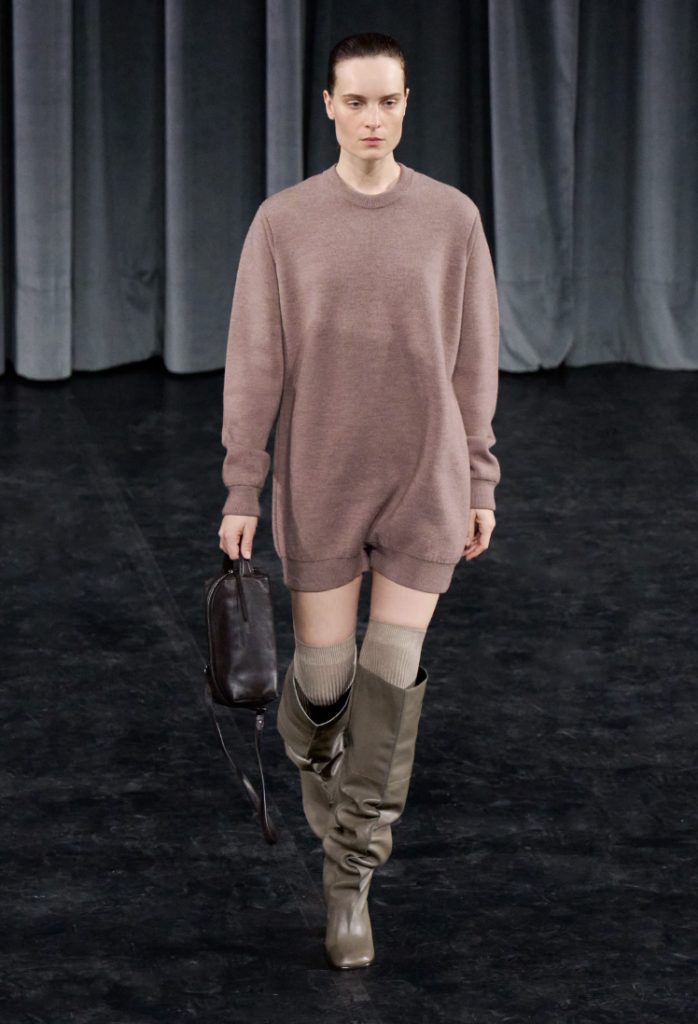 Una pieza audaz que fusiona un suéter oversize con un corte de pantalón corto, complementado con botas altas de piel y calcetas visibles, jugando con las capas de invierno.