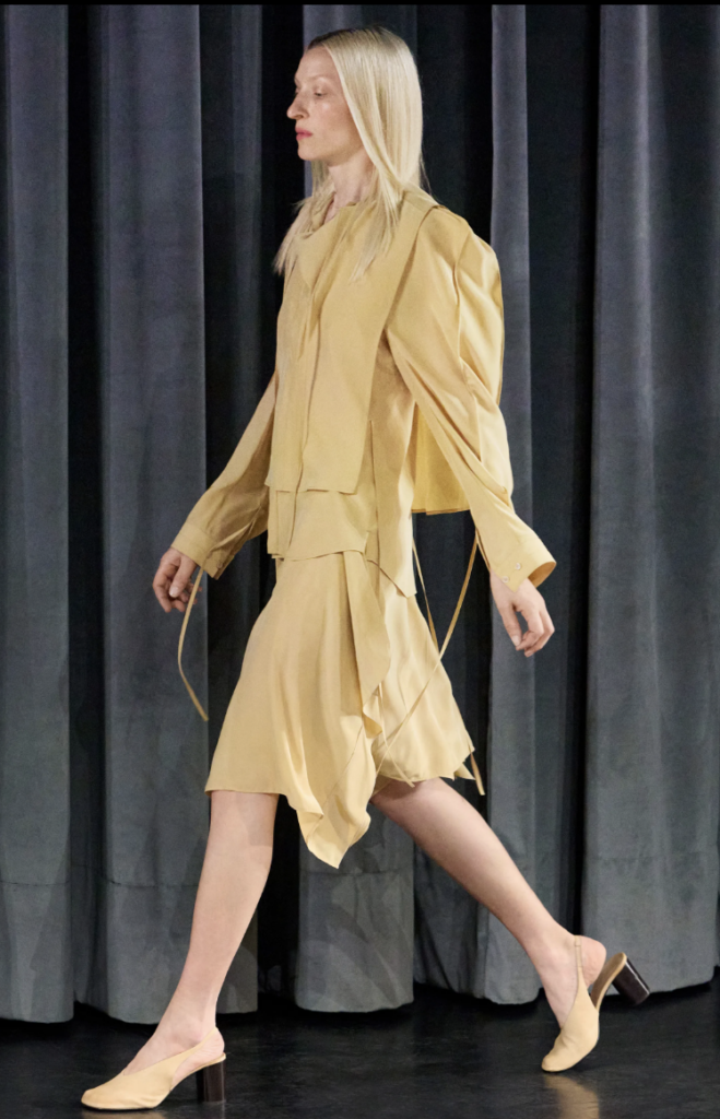 Inspirado en la danza, este vestido amarillo mantequilla presenta capas livianas y tiras que cuelgan, diseñado para cobrar vida con el caminar errático y artístico de la modelo.