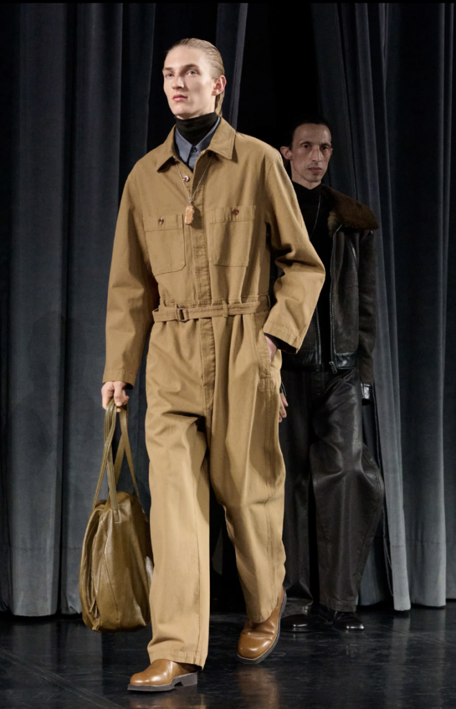 Un jumpsuit en gabardina color tabaco que personifica el enfoque pragmático de la marca. El cinturón anudado y el bolso XL refuerzan la estética del “uniforme de lujo”.