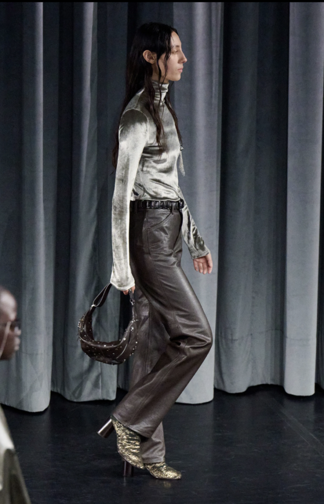 Un top de terciopelo en gris metalizado que fluye como mercurio sobre el cuerpo, combinado con pantalones de cuero marrón oscuro, creando un contraste de texturas exquisito.