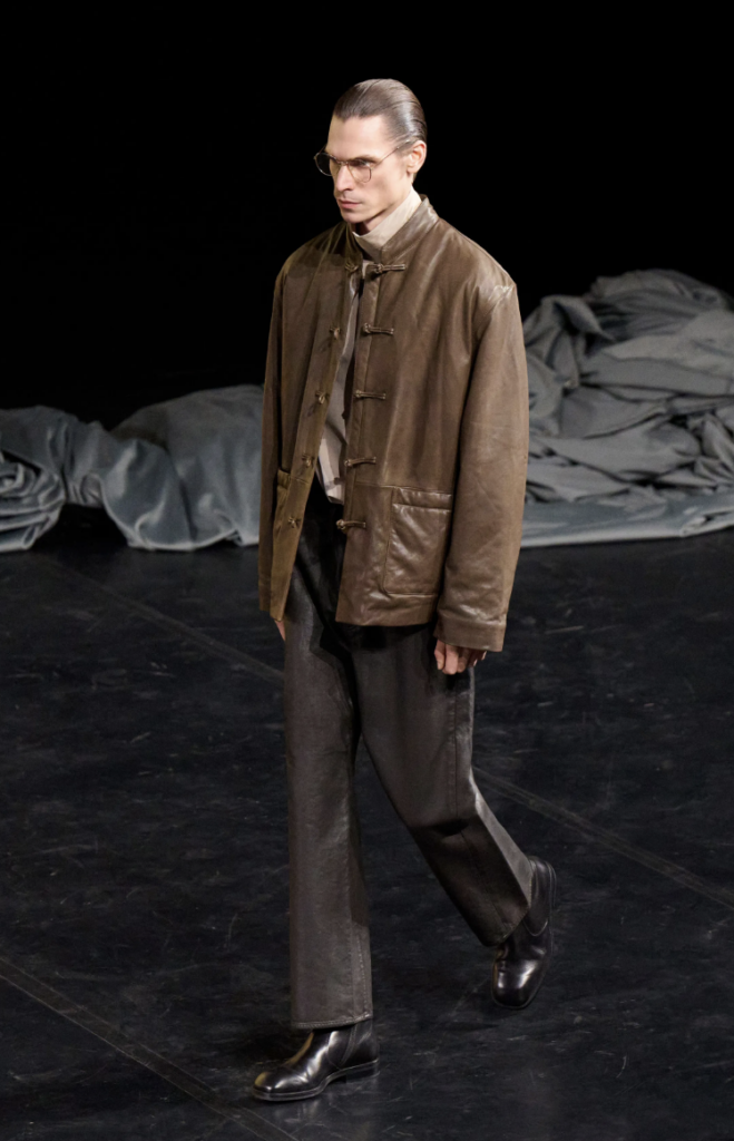 El cierre presenta una chaqueta de cuero con cierres de alamar, evocando influencias orientales, sobre pantalones oscuros de caída impecable, cerrando el círculo de una colección atemporal.