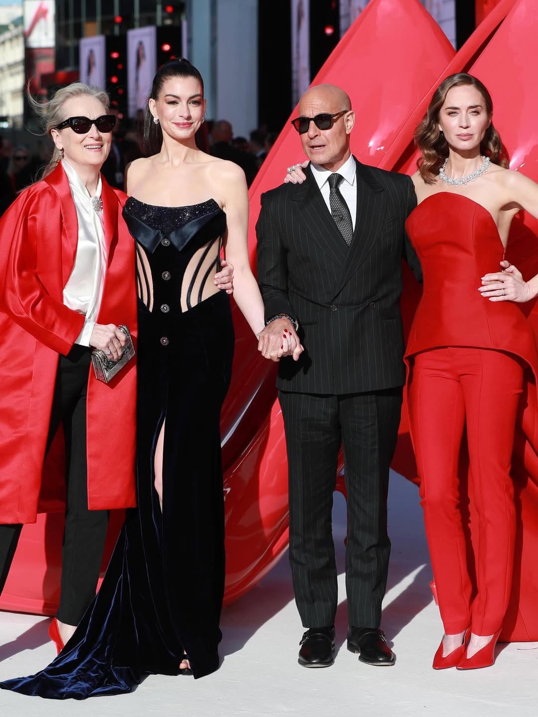 Anne Hathaway lleva un vestido midi de Susan Fang lleno de volumen y transparencias, un look sumamente femenino. Mientras que Meryl Streep apuesta por un total look de Saint Laurent, reafirmando ese estilo elegante, estructurado y poderoso que ha definido a la actriz durante toda la gira.