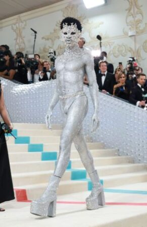 Vestido por Palomo Spain, el cantante lució un conjunto que combinaba corsetería dramática, cola de tul transparente, tocado de perlas flotantes y plataformas de más de 20 cm. Lil dijo que la inspiración fue “una princesa de otro planeta que se perdió en una ópera del siglo XVIII”.