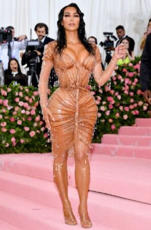 Kim sorprendió con un vestido de Thierry Mugler que parecía estar empapado. Literalmente. Las telas ceñidas a su cuerpo daban la ilusión de haber sido sumergidas en agua, mientras gotas de cristal colgaban estratégicamente, imitando gotas de rocío deslizándose por su piel.