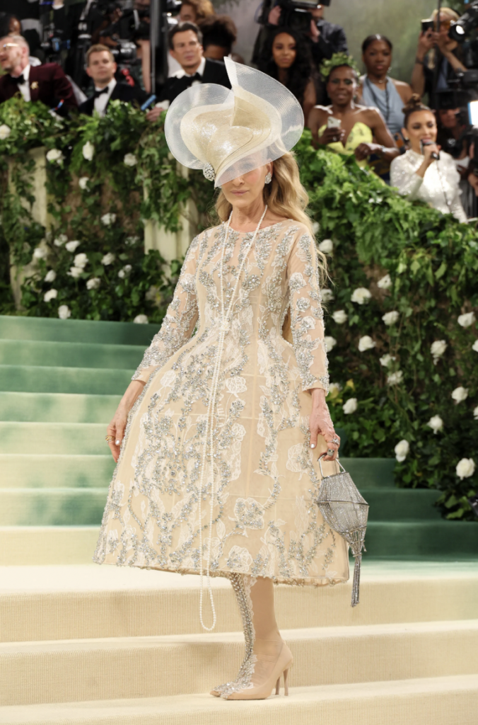 En la más reciente Gala Met, Parker apostó por la extravagancia con un diseño estructurado de Richard Quinn y un sombrero de Philip Treacy, consolidando su estatus como reina indiscutible del estilo.