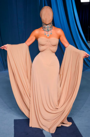 4. Asimismo, durante su aparición en la Gala anual del Academy Museum en Los Ángeles, Kim lució un vestido largo color beige de corte ceñido y escote palabra de honor, confeccionado en una tela translúcida que realzaba su figura y remataba en mangas caídas que se extendían hasta el suelo, de la colección Alta Costura Otoño 2025 de Maison Margiela.