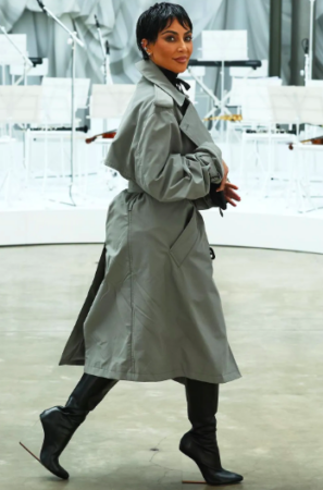 5. El 4 de octubre, durante el desfile de la colección Primavera/Verano 2026 de Maison Margiela, en la Semana de la Moda de París, la fundadora de SKIMS imitó el icónico peinado pixie de su madre, Kris Jenner. La socialité llegó al evento con una gabardina gris oversize, una gargantilla de cinta negra y botas de cuero a juego.