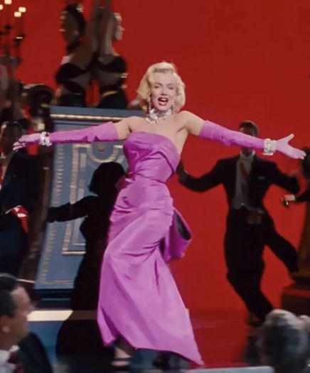 Otro de sus estilismos inolvidables es el vestido rosa sin tirantes que llevó para cantar “Diamonds Are a Girl’s Best Friend” en Los caballeros las prefieren rubias (1953). Con guantes largos y un moño gigante en la parte trasera, Marilyn elevó el concepto de “femme fatale” a una nueva dimensión. Esta imagen ha sido replicada por artistas como Madonna, Kylie Minogue y Margot Robbie, confirmando que Monroe fue pionera en fusionar el cine, la moda y el espectáculo.