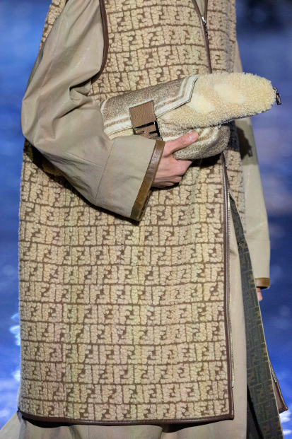 Mientras que el Fendi Baguette original se ha reinventado de múltiples maneras a lo largo del tiempo, Venturini Fendi exhibió bolsos de cachemir FF tejidos en forma de baguettes grandes. La colección continuó con el mismo clutch sujeto a un bolso Baguette real. Otra versión única del ícono de Fendi continuó con la aparición del pan como porta paraguas.
