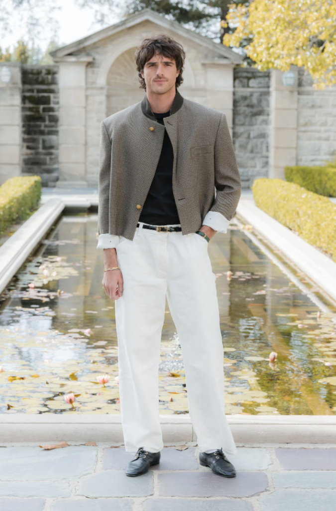 Elordi eligió una pieza clave del debut de Matthieu Blazy para Chanel primavera verano 2026: una chaqueta corta de lana marrón, concebida originalmente para mujer, con forro blanco visible y botones dorados. Lejos de buscar el efecto sorpresa, el actor integró la prenda con naturalidad en un estilismo relajado y preciso. Una camiseta oscura actuó como base neutra, mientras que unos vaqueros blancos de Chanel aportaron luz y equilibrio visual al conjunto.