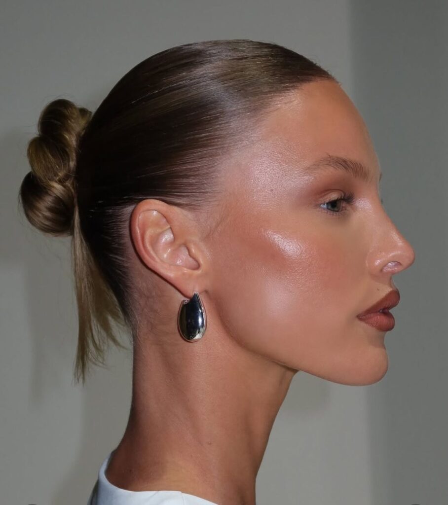 Aquí no hay lugar para el mate extremo ni para el brillo artificial. La piel debe verse flexible, viva y real. El rubor en tonos durazno o terracota suave se convierte en protagonista, aplicado de forma difuminada para imitar el rubor natural que aparece después del sol.