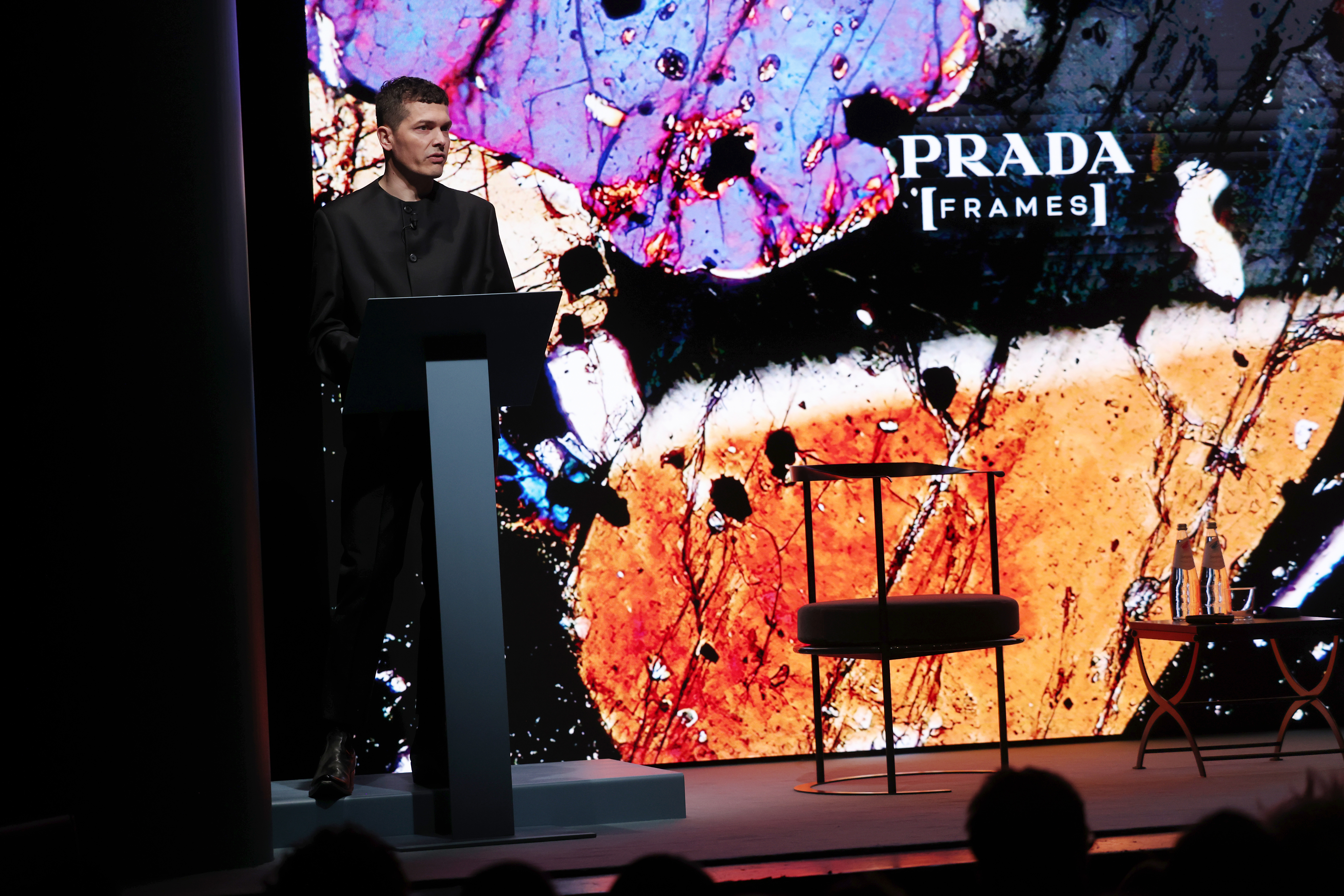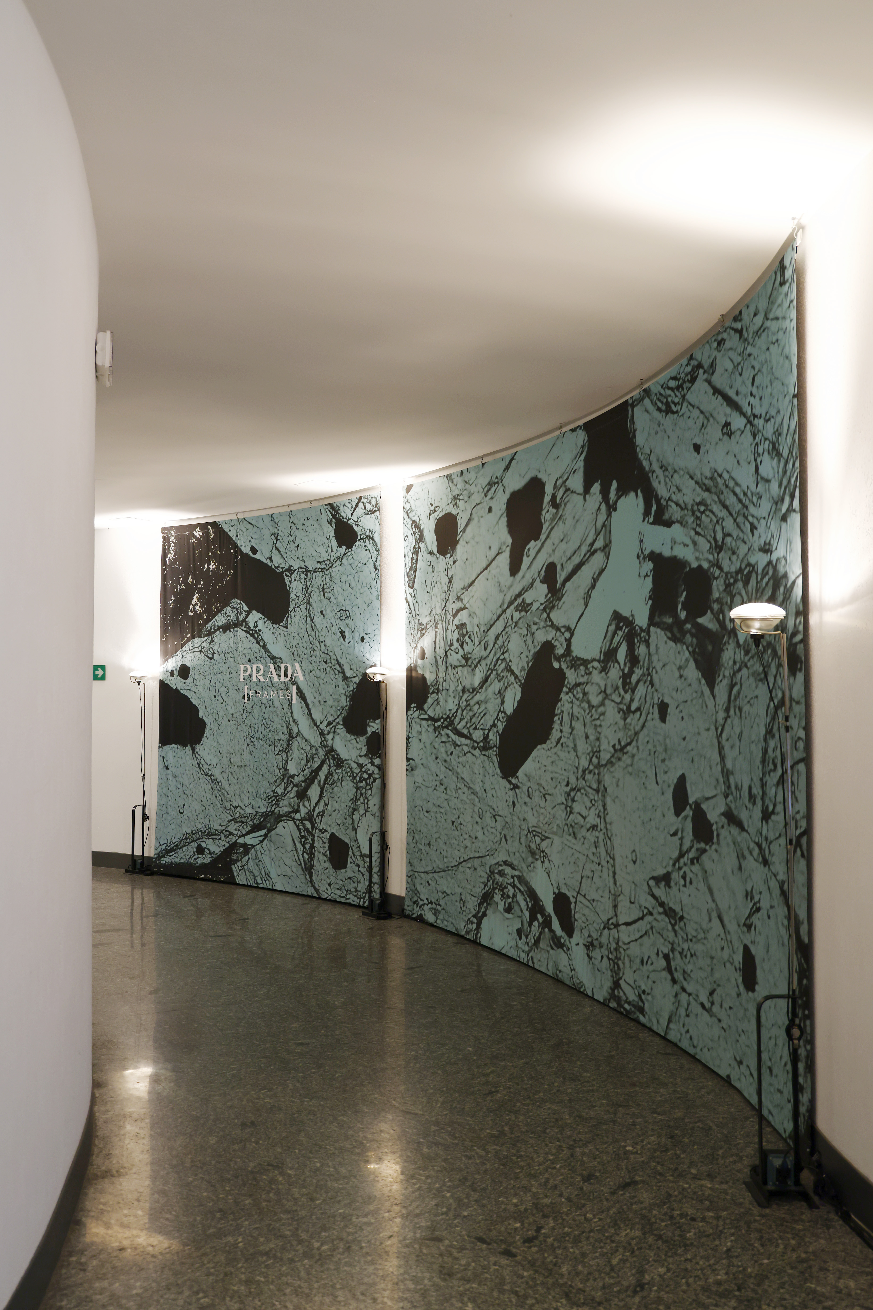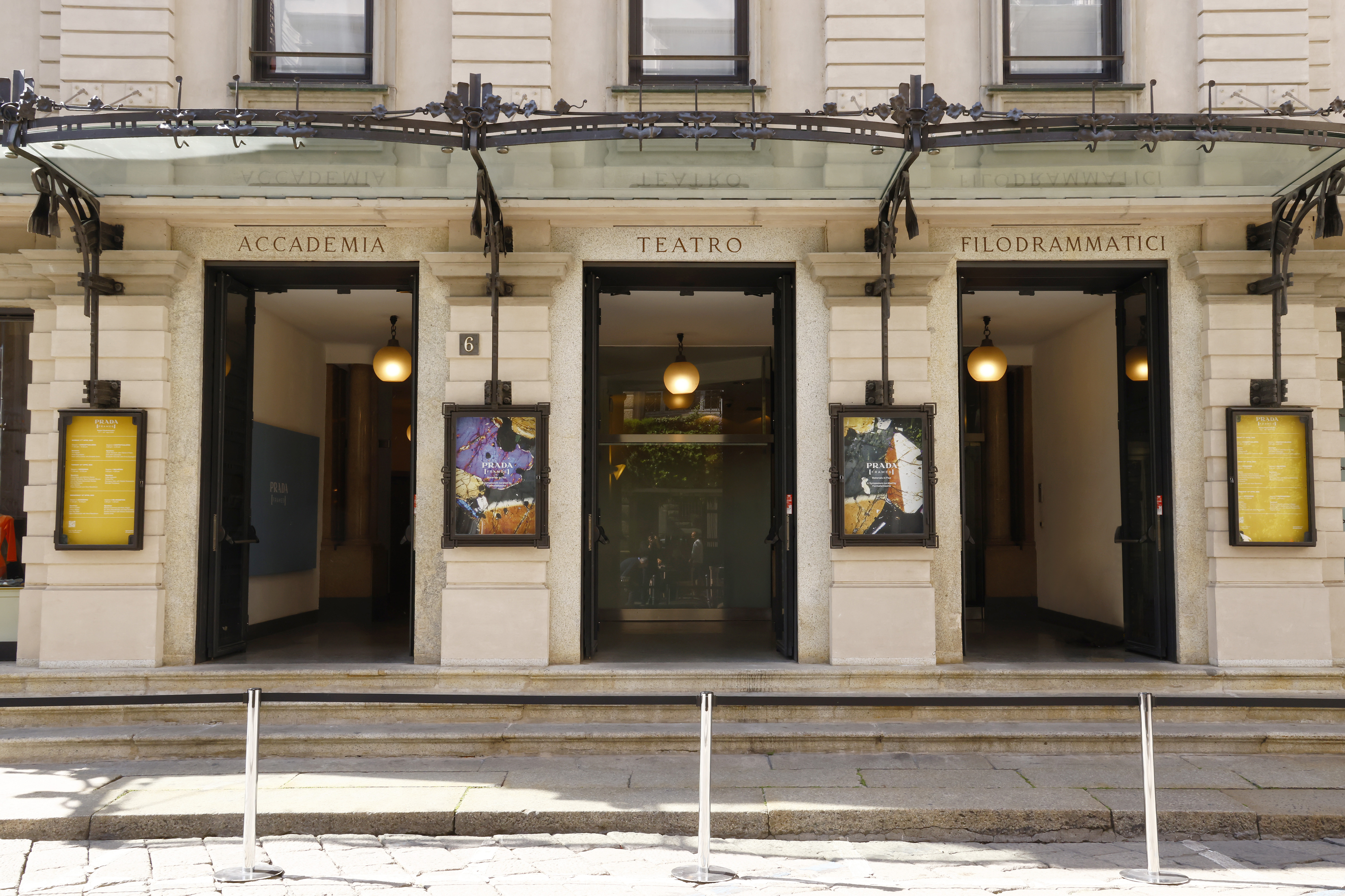 Prada Frames está alojado en el Teatro Filodrammatici, uno de los más antiguos de Milán, ubicado a poca distancia de La Scala y Piazza Duomo. Para el montaje se utilizó una selección de muebles y lámparas de Azucena, marca del Grupo B&B Italia. Estas piezas icónicas están diseñadas por el arquitecto Luigi Caccia Dominioni a partir de finales de la década de 1940.