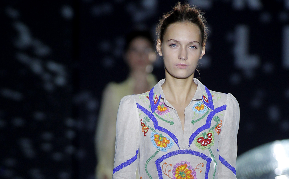 Los estampados de esta casa, que cumple 15 años de desfilar en Cibeles, se inspiran en el impresionismo y cubren la pasarela de lirios gigantes. Elegante, con cortes y escotes pronunciados en frente o espalda, vestidos largos con monos de fondo que dejan ver las piernas en estampadas transparencias. Olanes en diagonal que brindan movimiento, cada pieza nos transmite un estilo definitivamente royal cool.